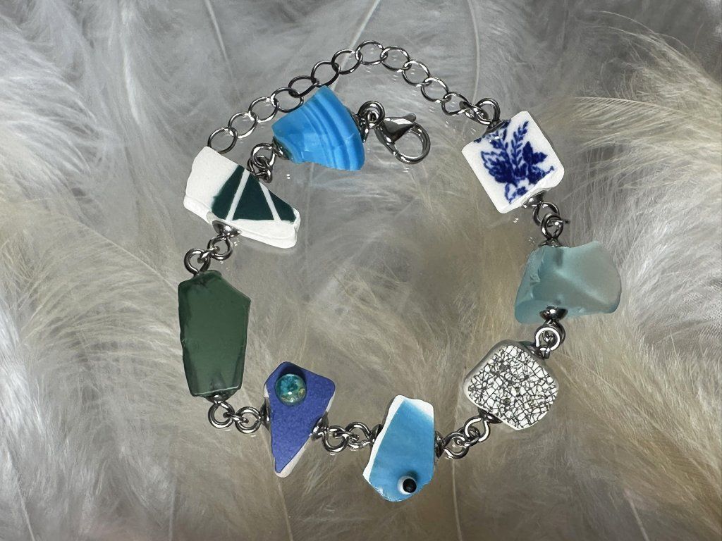 Každý střípek má svou vlastní minulost. Dříve byl třeba cukřenkou, která se rozbila či sklenicí. Díky upcyklaci dostávají druhý život například v podobě těchto zajímavých náramků.