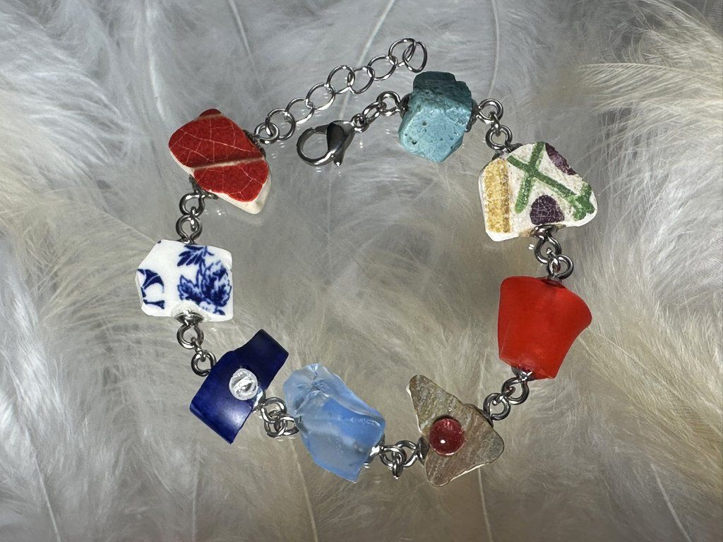 Ojedinělý náramek, který vyrábím z nalezených či již nepotřebných kousků skla, keramiky nebo sázavínků. Vše pískuji, dobrušuji a některé střípky doplňuji kapičkou spékaného skla obsahující v sobě stříbro, které háže krásné a jemné odlesky.