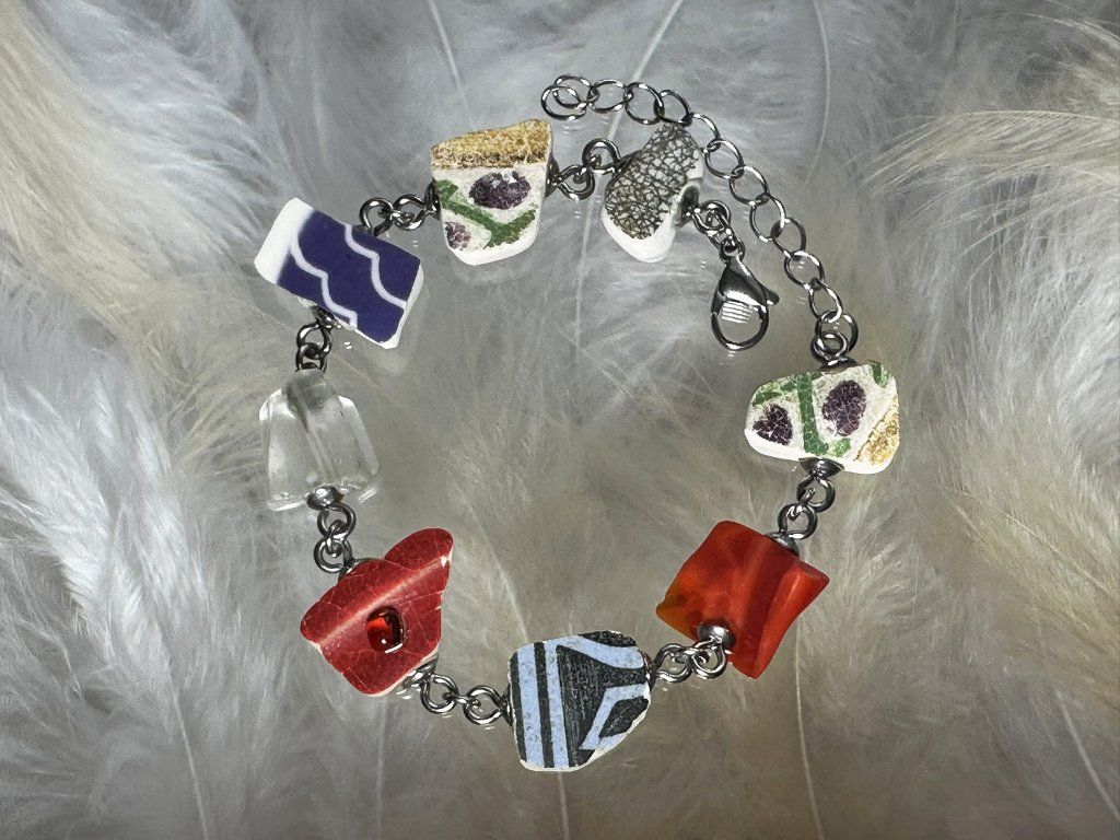 Každý střípek má svou vlastní minulost. Dříve byl třeba cukřenkou, která se rozbila či sklenicí. Díky upcyklaci dostávají druhý život například v podobě těchto zajímavých náramků.