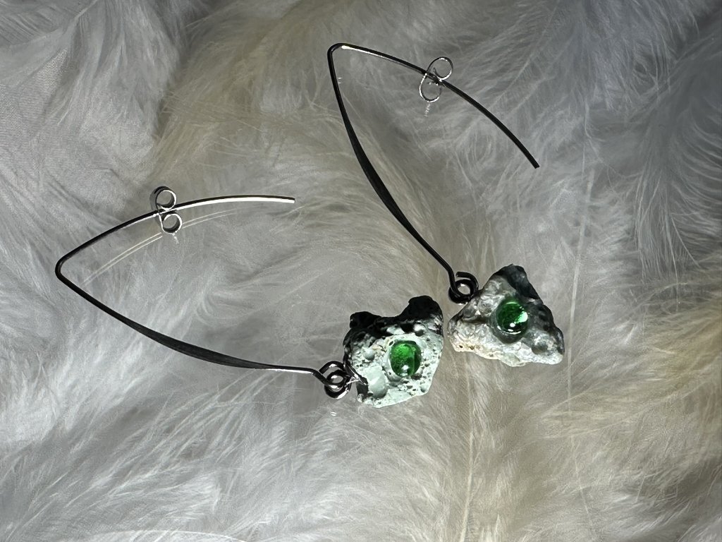 Tyto náušnice jsou unikátními nálezy, které hledám v řece Sázavě. Vše brousím a zpracovávám do jedinečných šperků, které jsou jedním jediným originálem. Dozdobuji kousky skla. Některé v sobě obsahuje stříbro a tím háže jemné a přesto nepřehlédnutelné odlesky.