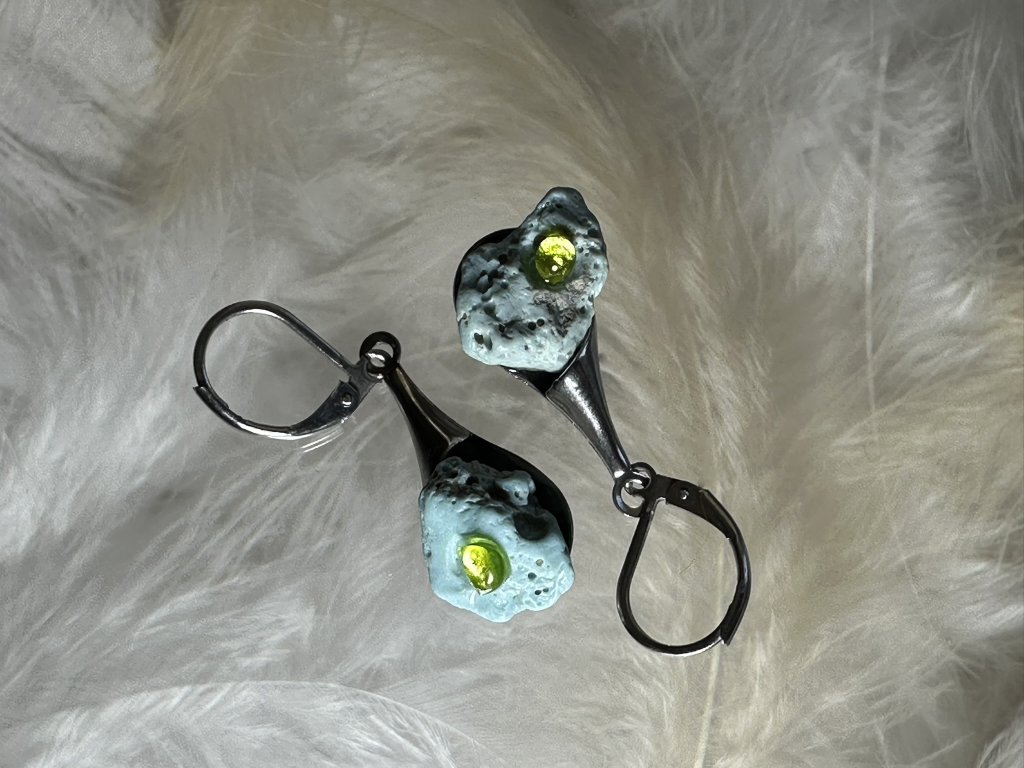 Tyto náušnice jsou unikátními nálezy, které hledám v řece Sázavě. Vše brousím a zpracovávám do jedinečných šperků, které jsou jedním jediným originálem. Dozdobuji kousky skla. Některé v sobě obsahuje stříbro a tím háže jemné a přesto nepřehlédnutelné odlesky.