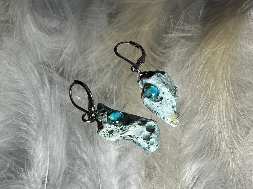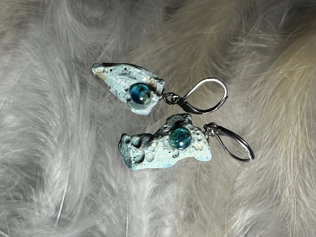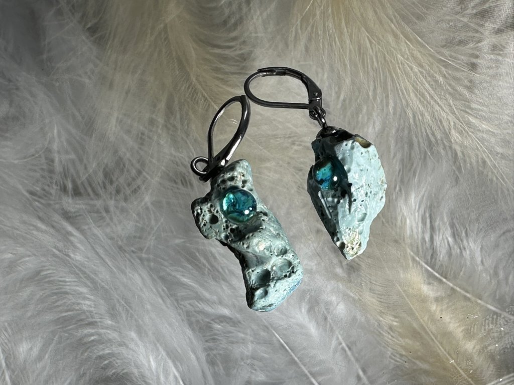 Tyto náušnice jsou unikátními nálezy, které hledám v řece Sázavě. Vše brousím a zpracovávám do jedinečných šperků, které jsou jedním jediným originálem. Dozdobuji kousky skla. Některé v sobě obsahuje stříbro a tím háže jemné a přesto nepřehlédnutelné odlesky.