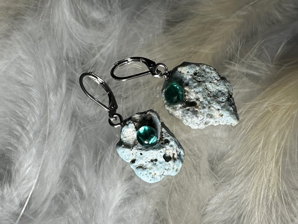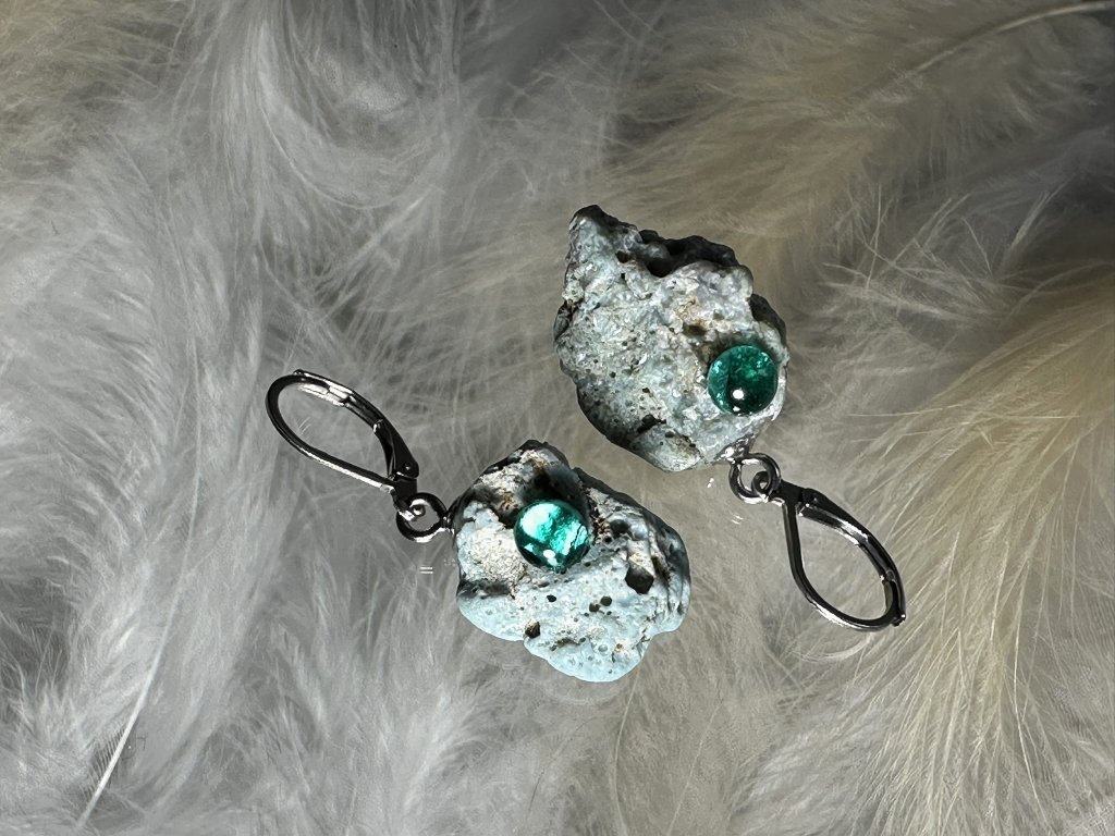 Tyto náušnice jsou unikátními nálezy, které hledám v řece Sázavě. Vše brousím a zpracovávám do jedinečných šperků, které jsou jedním jediným originálem. Dozdobuji kousky skla. Některé v sobě obsahuje stříbro a tím háže jemné a přesto nepřehlédnutelné odlesky.