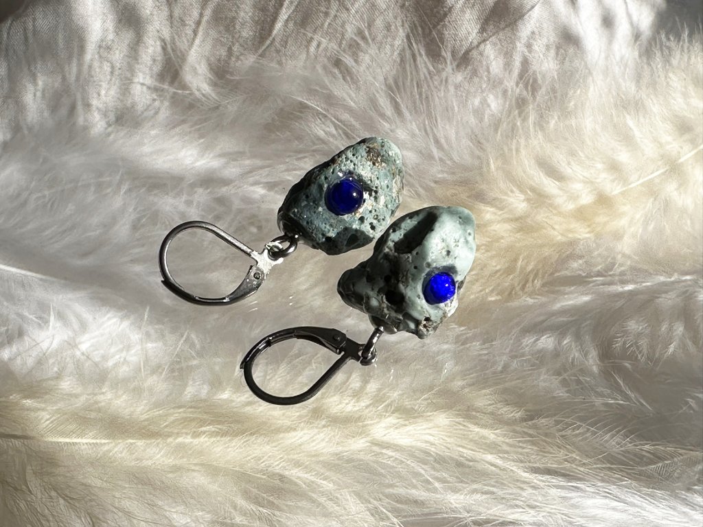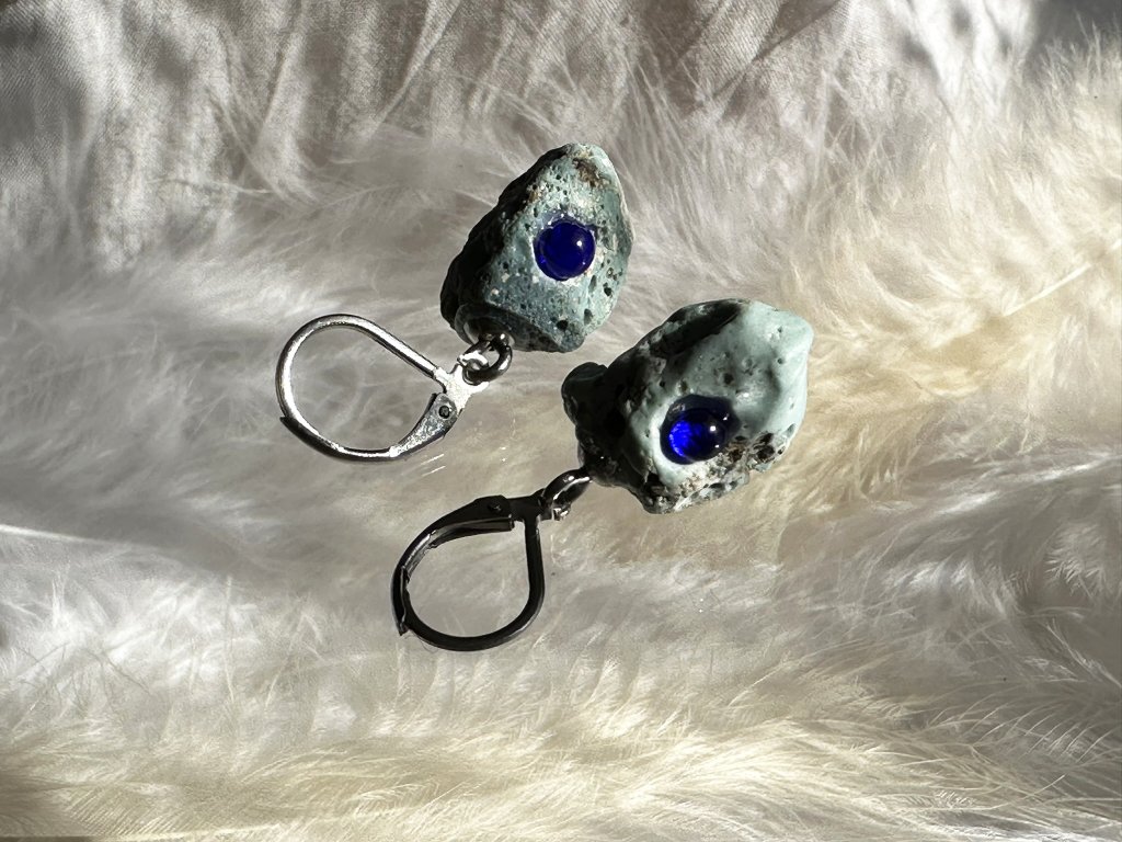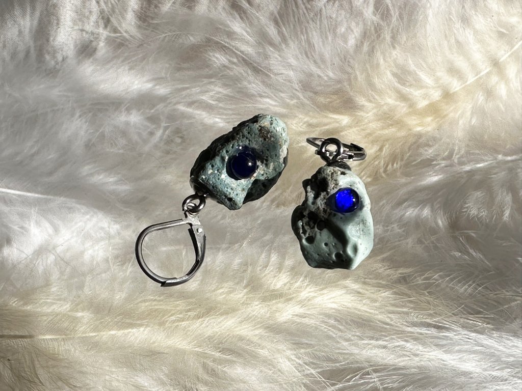Tyto náušnice jsou unikátními nálezy, které hledám v řece Sázavě. Vše brousím a zpracovávám do jedinečných šperků, které jsou jedním jediným originálem. Dozdobuji kousky skla. Některé v sobě obsahuje stříbro a tím háže jemné a přesto nepřehlédnutelné odlesky.