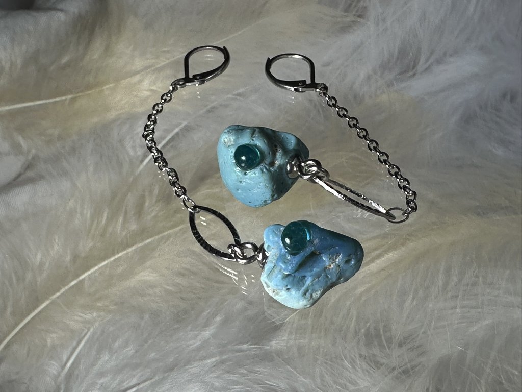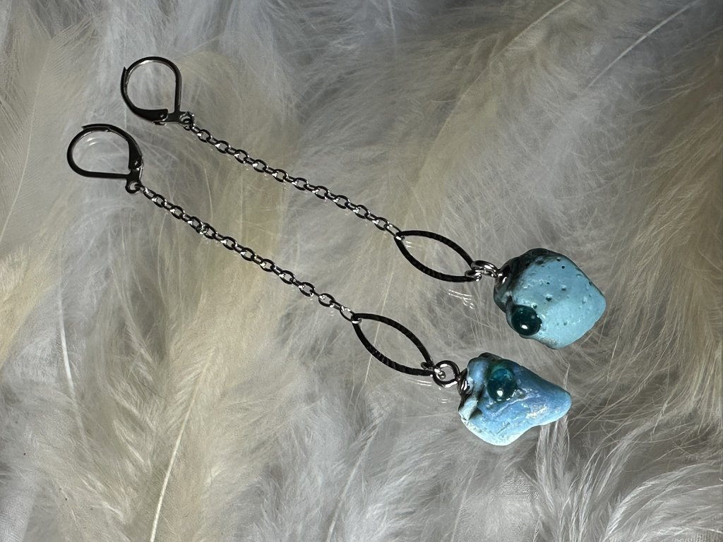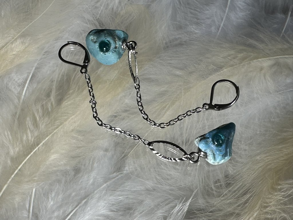 Tyto náušnice jsou unikátními nálezy, které hledám v řece Sázavě. Vše brousím a zpracovávám do jedinečných šperků, které jsou jedním jediným originálem. Dozdobuji kousky skla.