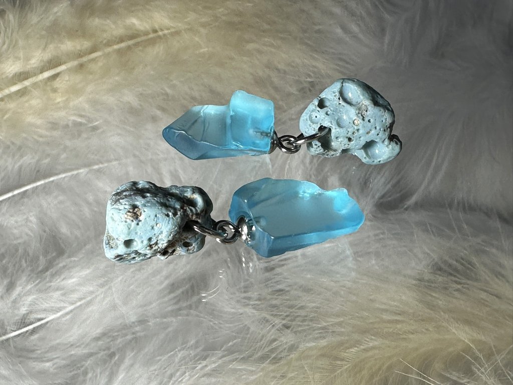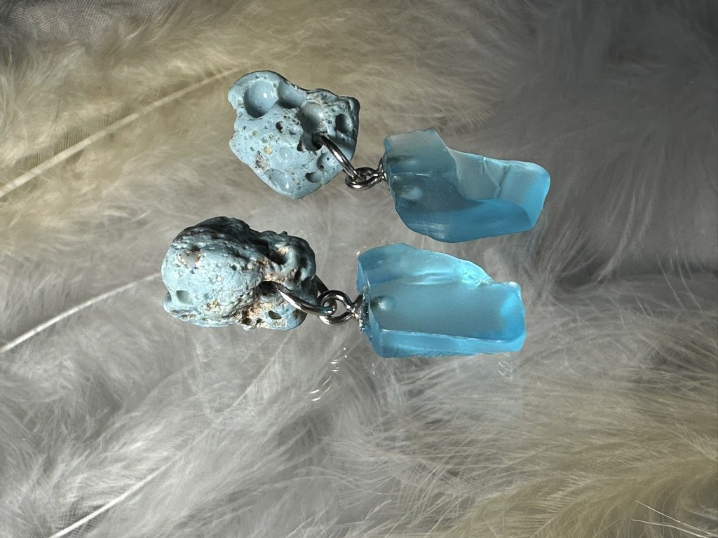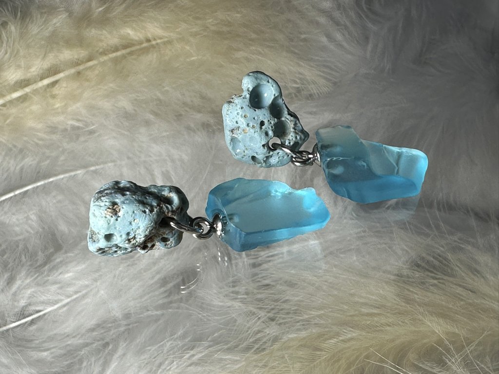 Tyto náušnice jsou unikátními nálezy, které hledám v řece Sázavě. Vše brousím a zpracovávám do jedinečných šperků, které jsou jedním jediným originálem. Dozdobuji kousky skla.