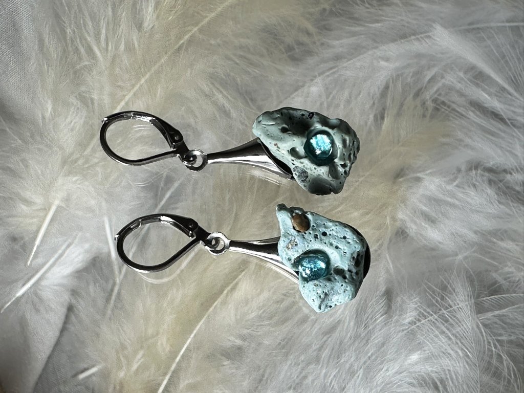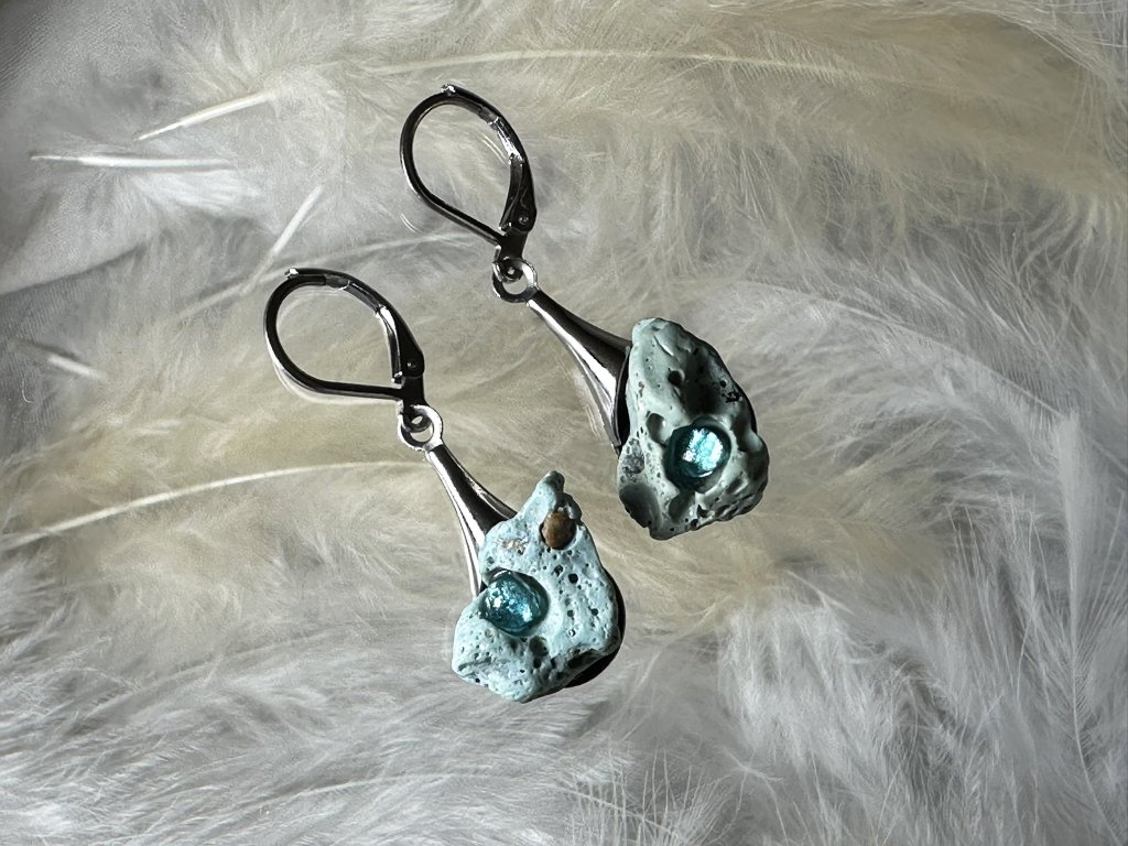 Tyto náušnice jsou unikátními nálezy, které hledám v řece Sázavě. Vše brousím a zpracovávám do jedinečných šperků, které jsou jedním jediným originálem. Dozdobuji kousky skla. Některé v sobě obsahuje stříbro a tím háže jemné a přesto nepřehlédnutelné odlesky.