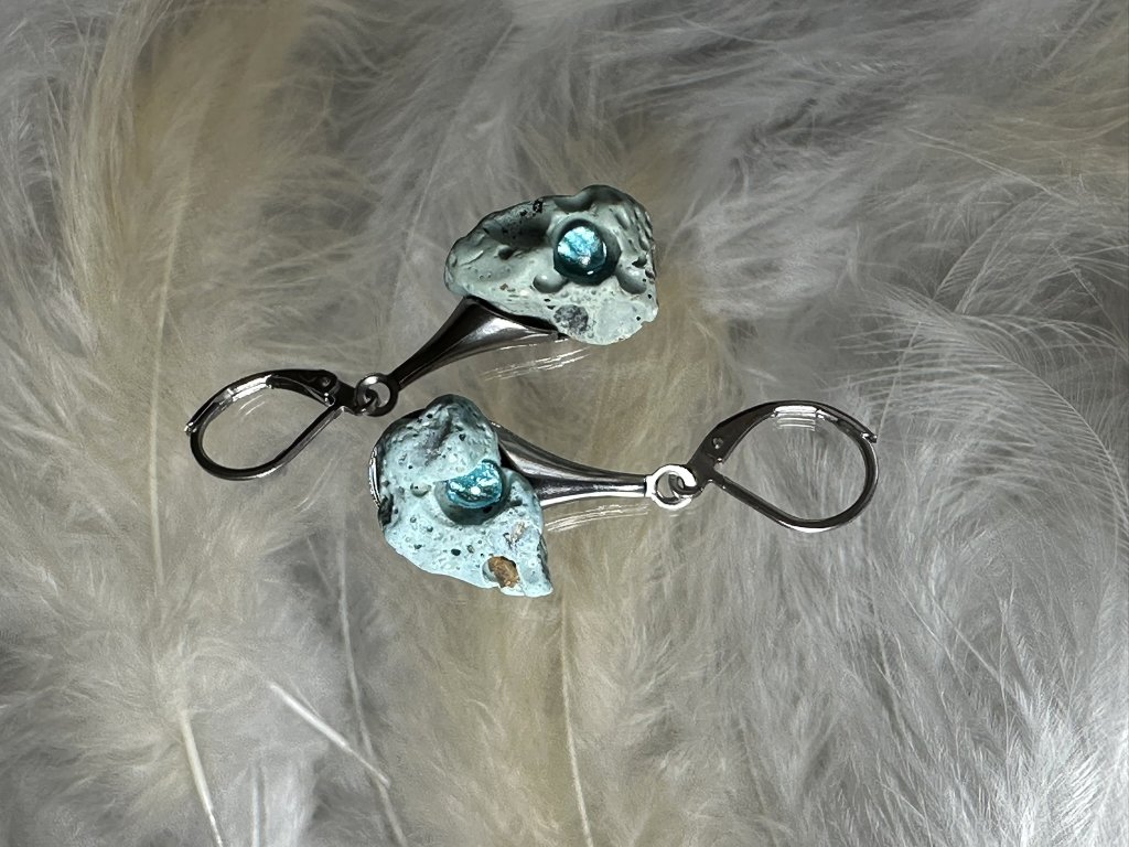 Náušnice z kolekce Sázavíny jsou unikátní kousky, které v sobě nesou kousky historie. Jde o ojedinělé nálezy v řece Sázavě, kde Sázavíny sbírám a dále je obrušuji, zpracovávám a doplňuji kousky skla obsahující v sobě často stříbro.