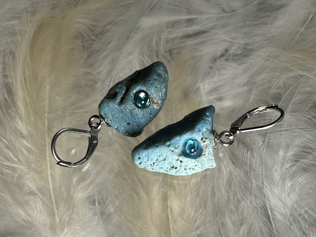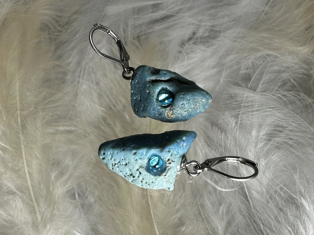 Tyto náušnice jsou unikátními nálezy, které hledám v řece Sázavě. Vše brousím a zpracovávám do jedinečných šperků, které jsou jedním jediným originálem. Dozdobuji kousky skla. Některé v sobě obsahuje stříbro a tím háže jemné a přesto nepřehlédnutelné odlesky.