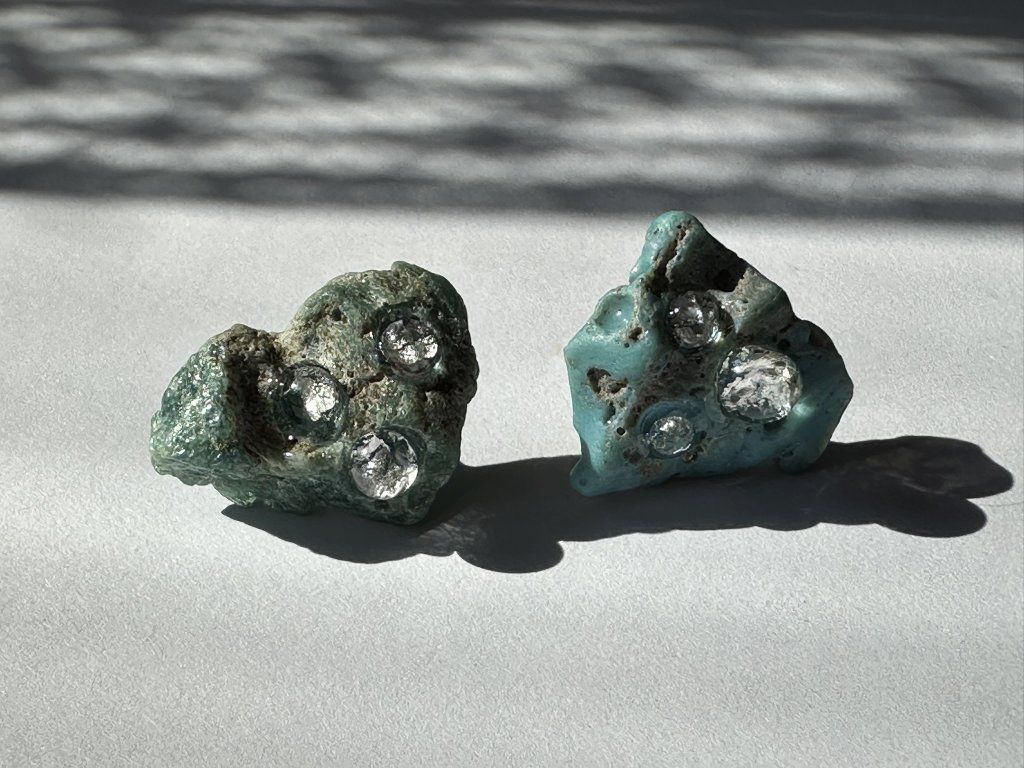 Náušnice z kolekce Sázavíny jsou unikátní kousky, které v sobě nesou kousky historie. Jde o ojedinělé nálezy v řece Sázavě, kde Sázavíny sbírám a dále je obrušuji, zpracovávám a doplňuji kousky skla obsahující v sobě často stříbro.