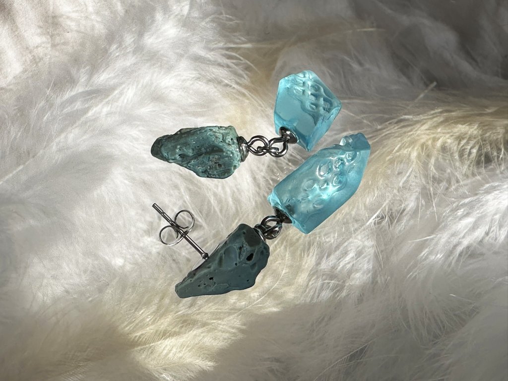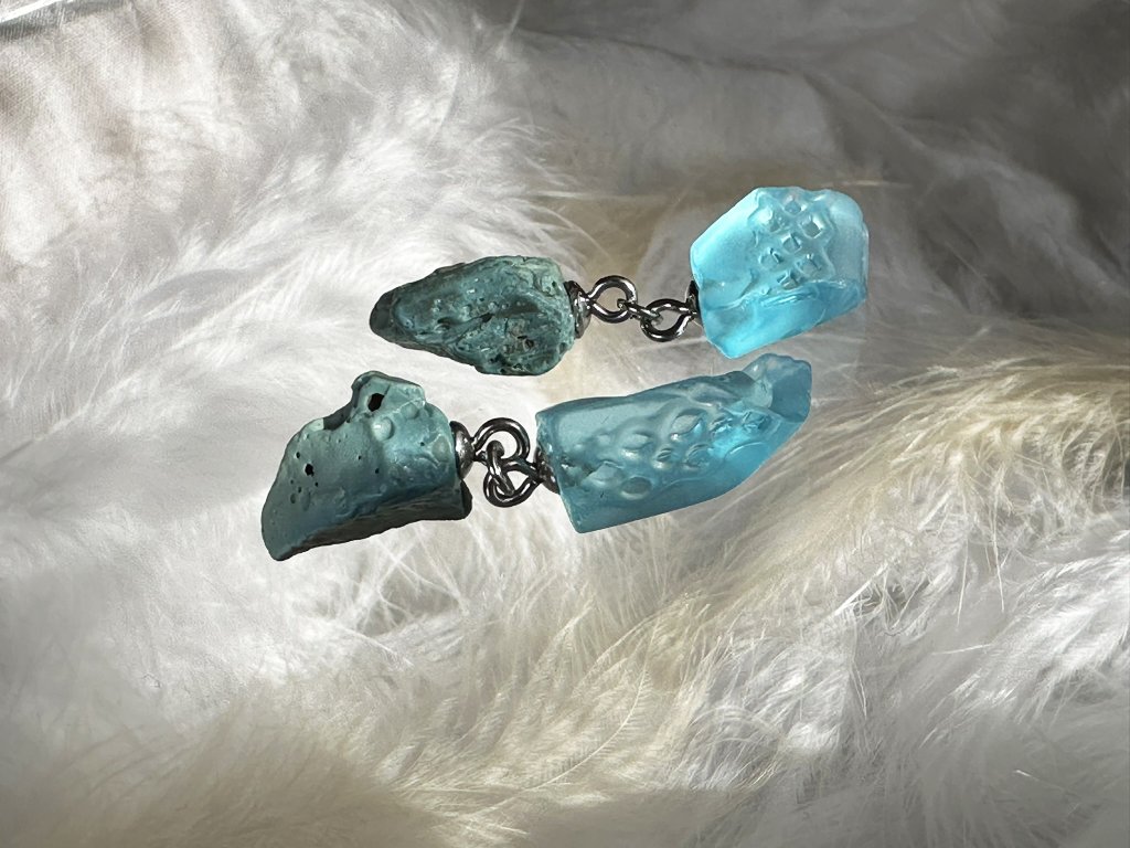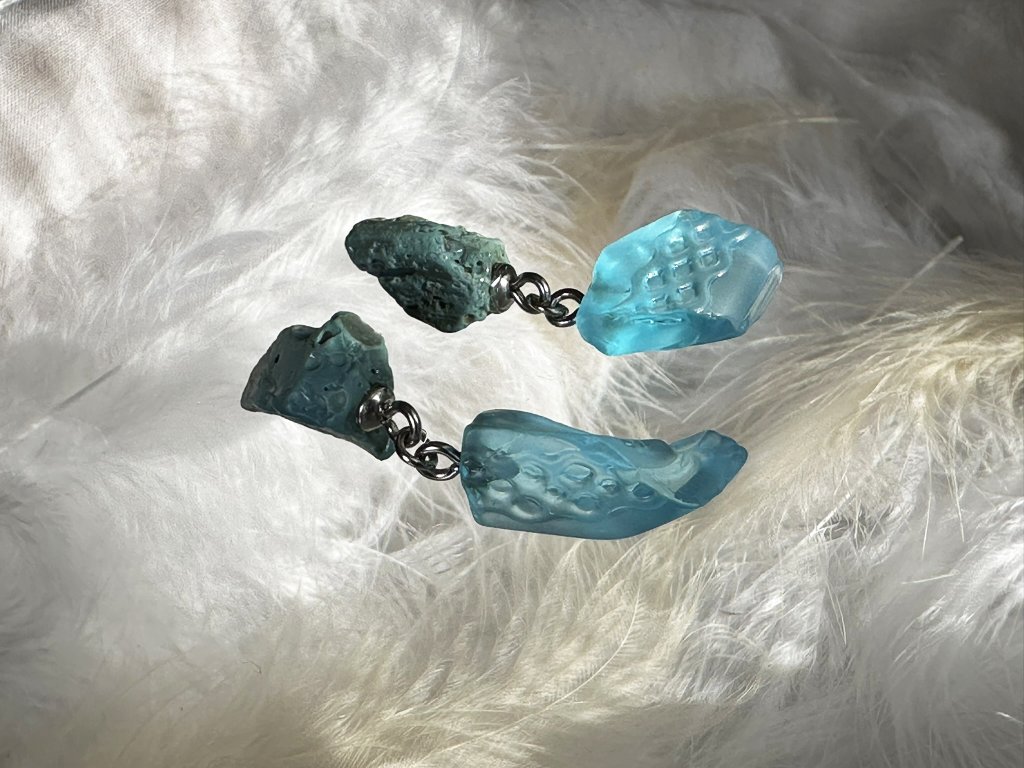 Tyto náušnice jsou unikátními nálezy, které hledám v řece Sázavě. Vše brousím a zpracovávám do jedinečných šperků, které jsou jedním jediným originálem. Dozdobuji kousky skla.