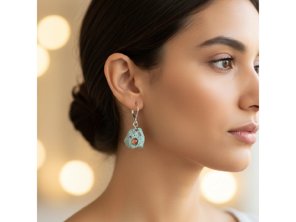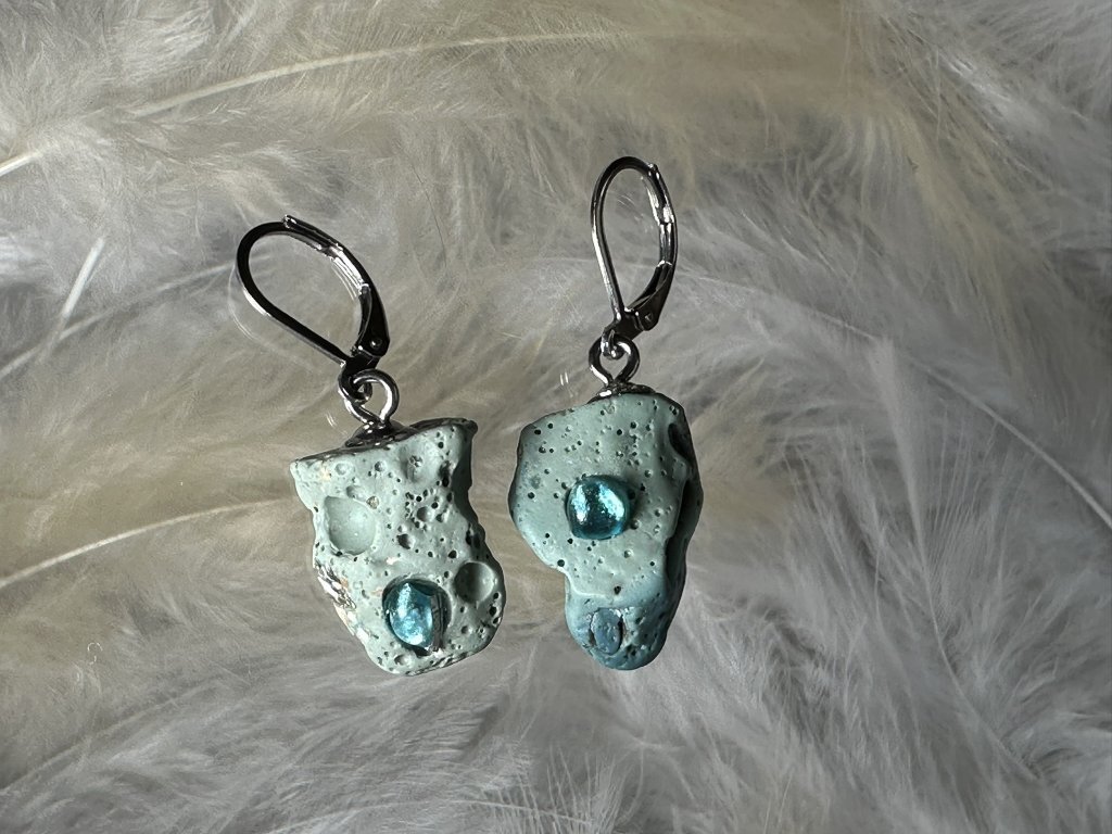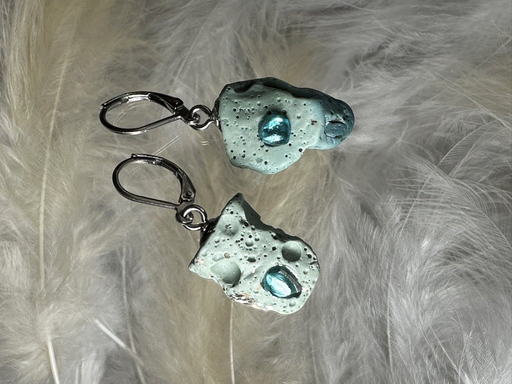 Tyto náušnice jsou unikátními nálezy, které hledám v řece Sázavě. Vše brousím a zpracovávám do jedinečných šperků, které jsou jedním jediným originálem. Dozdobuji kousky skla. Některé v sobě obsahuje stříbro a tím háže jemné a přesto nepřehlédnutelné odlesky.