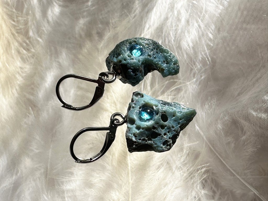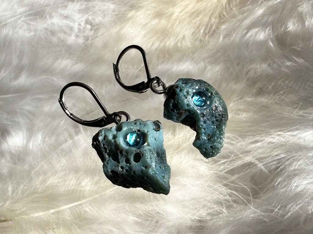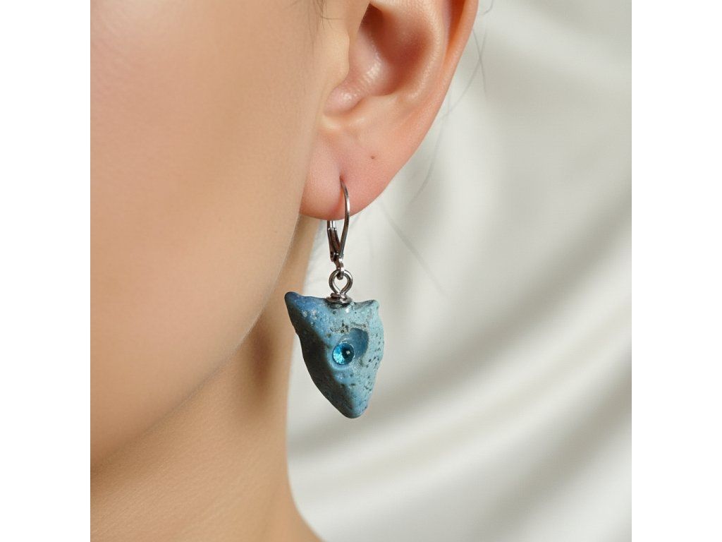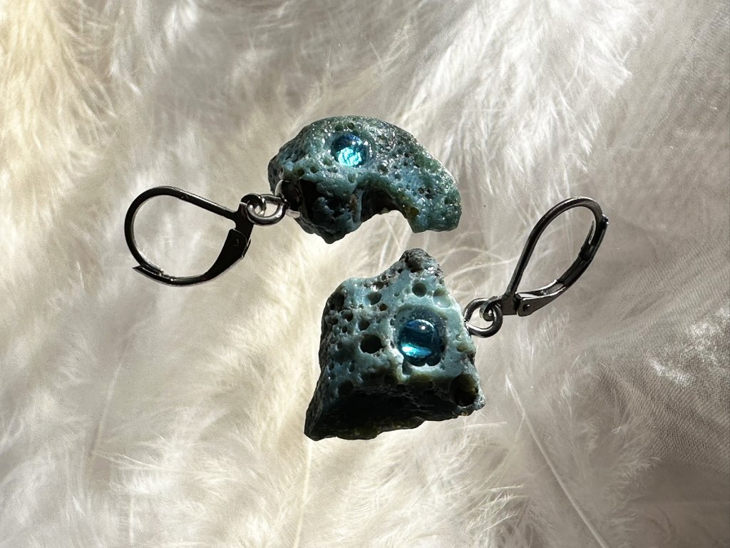 Tyto náušnice jsou unikátními nálezy, které hledám v řece Sázavě. Vše brousím a zpracovávám do jedinečných šperků, které jsou jedním jediným originálem. Dozdobuji kousky skla. Některé v sobě obsahuje stříbro a tím háže jemné a přesto nepřehlédnutelné odlesky.