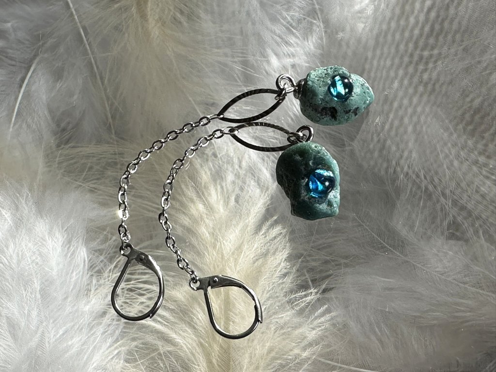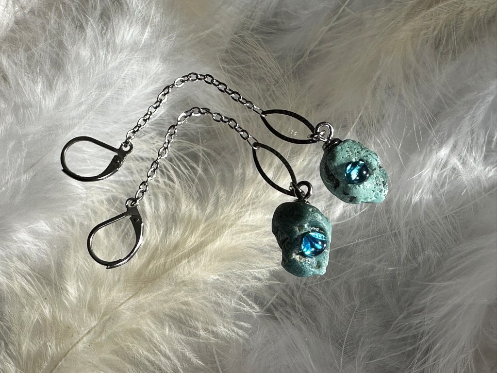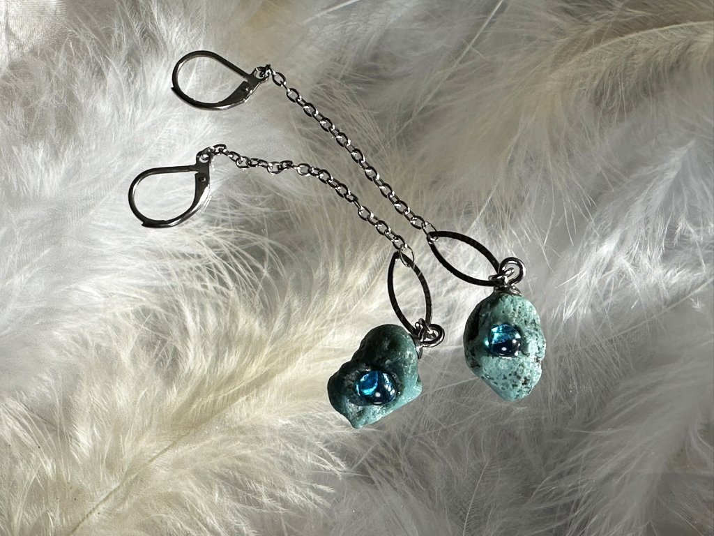 Tyto náušnice jsou unikátními nálezy, které hledám v řece Sázavě. Vše brousím a zpracovávám do jedinečných šperků, které jsou jedním jediným originálem. Dozdobuji kousky skla.