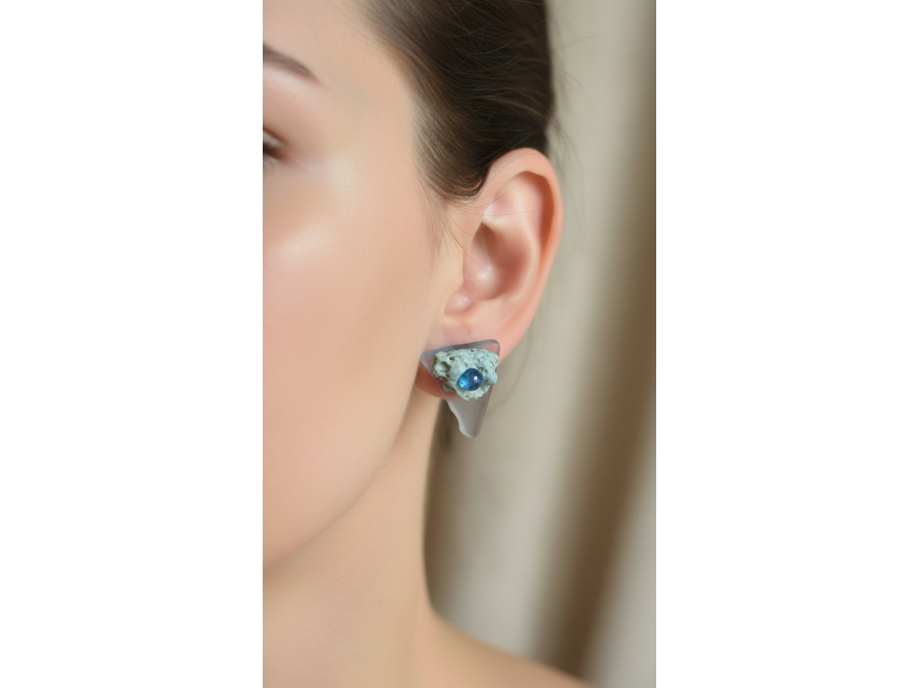 Autorské náušnice, kde se snoubí krása křehkého skla a zemitost sázavínů. Propojuji zde kolekci Nanovo a Sázavíny a zároveň dva živly - oheň a vodu.