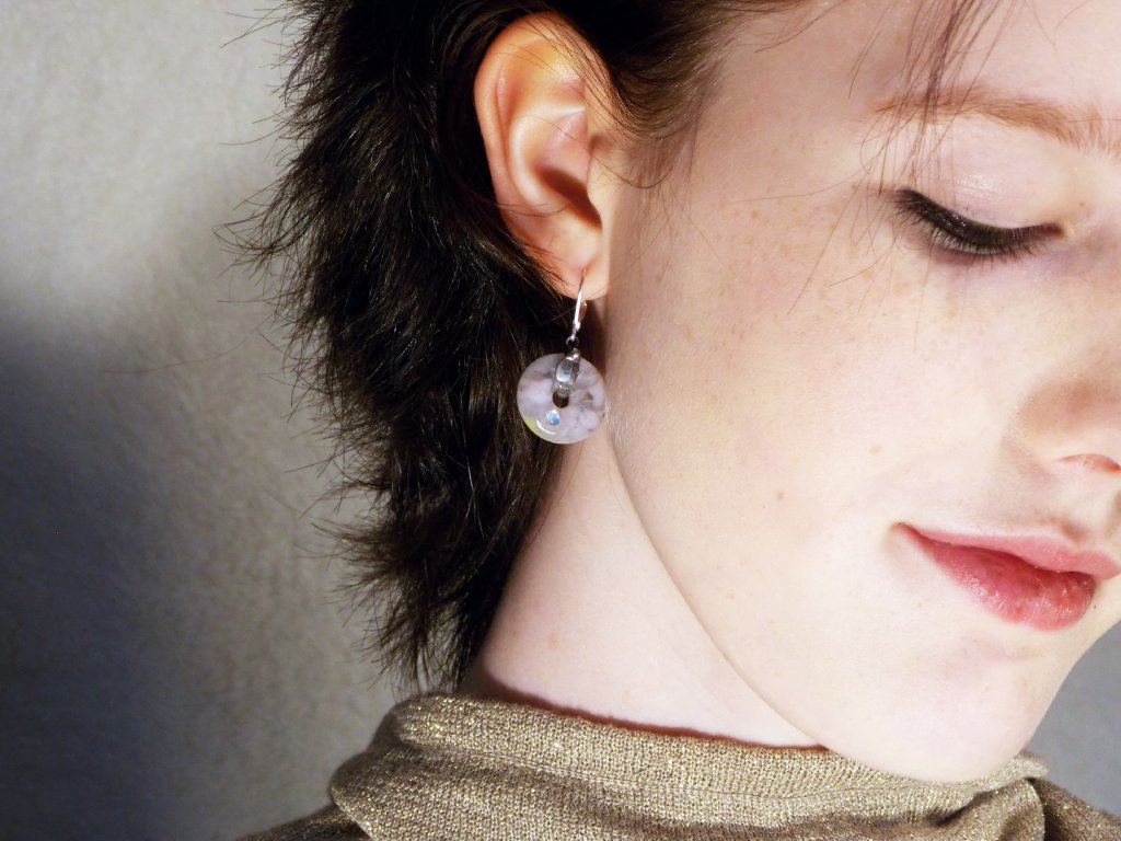 Náušnice jsou vyrobeny spékáním sklíček do kruhového tvaru a osazeno kapkou z dichroického skla s odleskem.