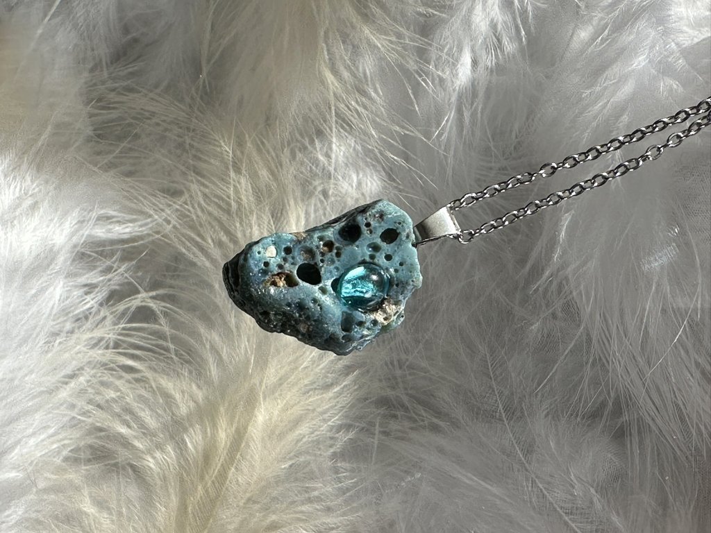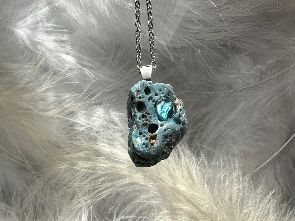 Tyto přívěsky jsou unikátními nálezy, které hledám v řece Sázavě. Vše brousím a zpracovávám do jedinečných šperků, které jsou jedním jediným originálem. Dozdobuji kousky skla, které v sobě obsahuje stříbro a tím háže jemné a přesto nepřehlédnutelné odlesky.
