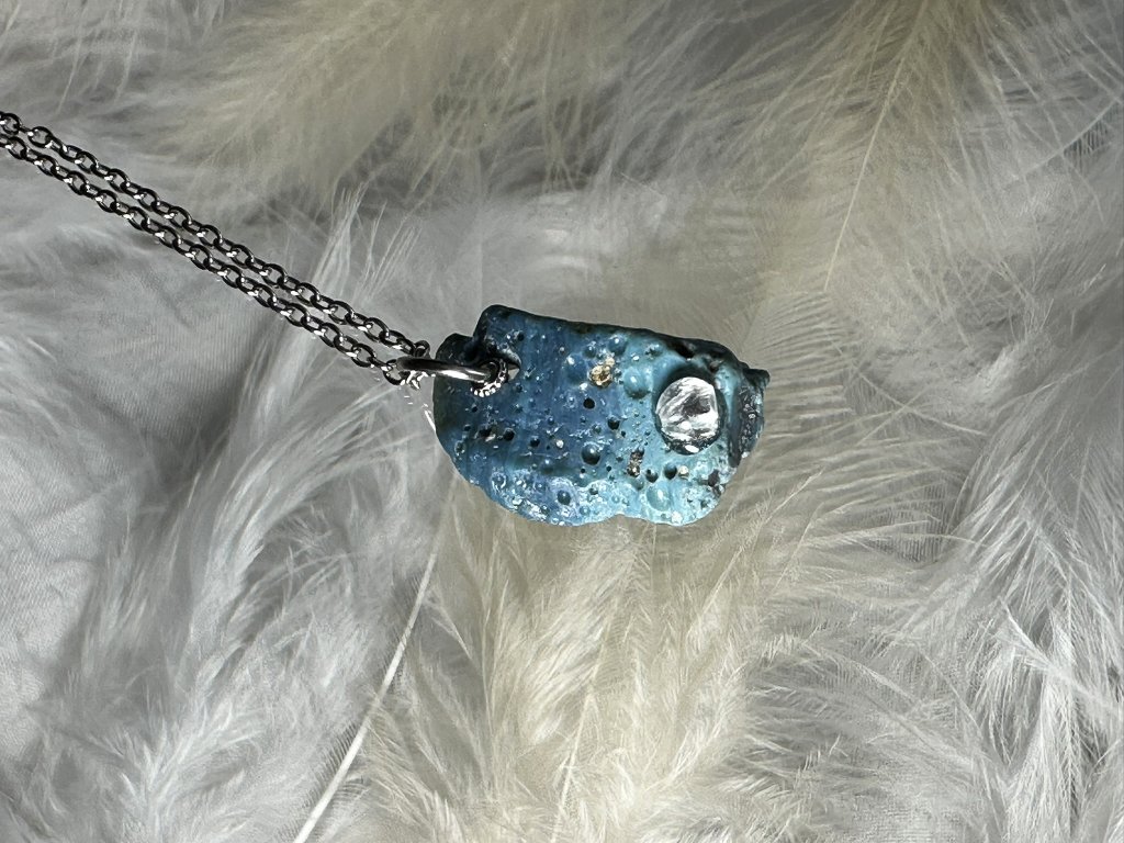 Tyto přívěsky jsou unikátními nálezy, které hledám v řece Sázavě. Vše brousím a zpracovávám do jedinečných šperků, které jsou jedním jediným originálem. Dozdobuji kousky skla, které v sobě obsahuje stříbro a tím háže jemné a přesto nepřehlédnutelné odlesky.