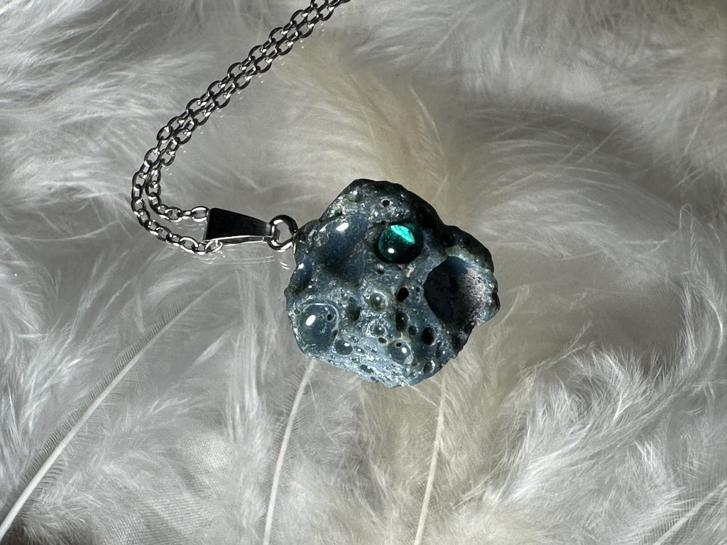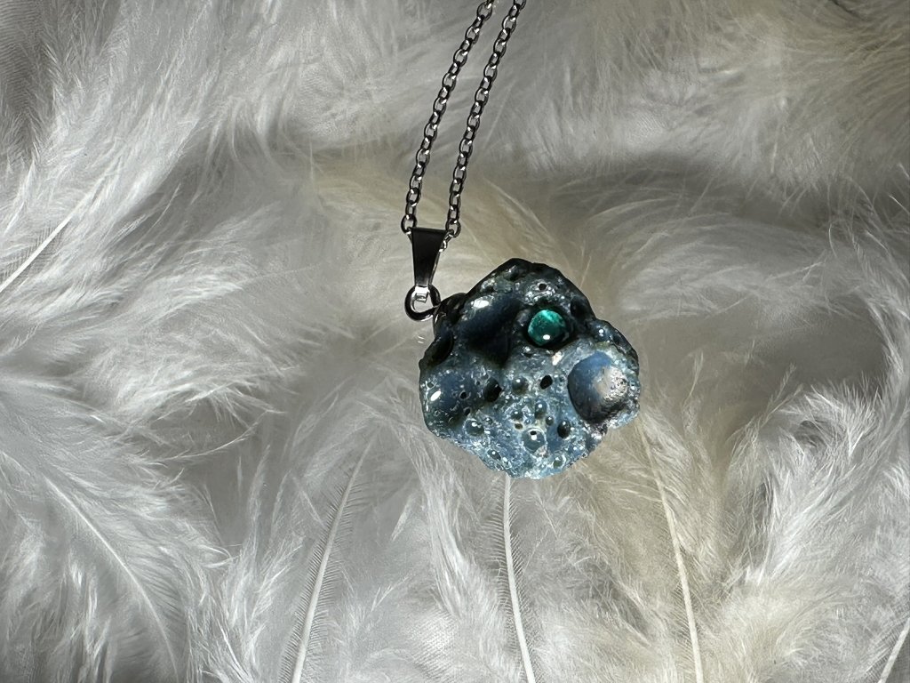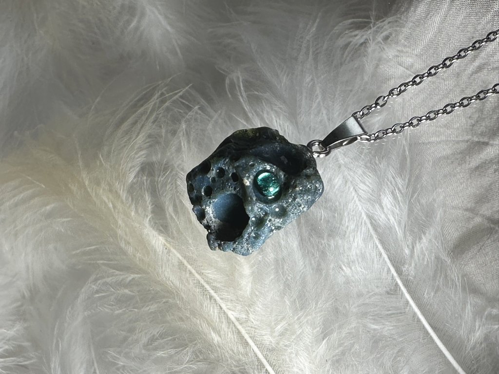 Tyto přívěsky jsou unikátními nálezy, které hledám v řece Sázavě. Vše brousím a zpracovávám do jedinečných šperků, které jsou jedním jediným originálem. Dozdobuji kousky skla, které v sobě obsahuje stříbro a tím háže jemné a přesto nepřehlédnutelné odlesky.