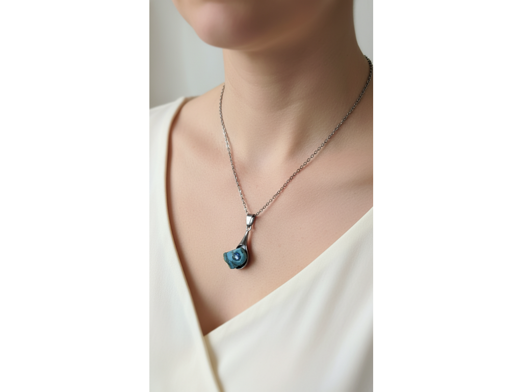 Zavěšeno na řetízku z kvalitní, antialergenní nerez oceli o délce 55 cm.