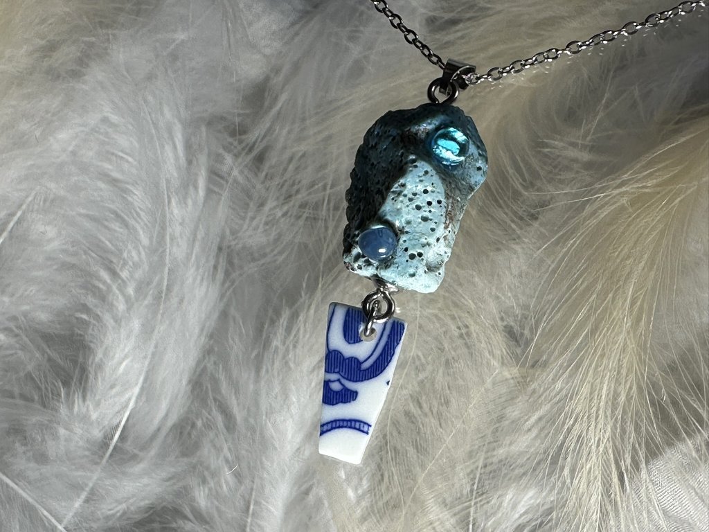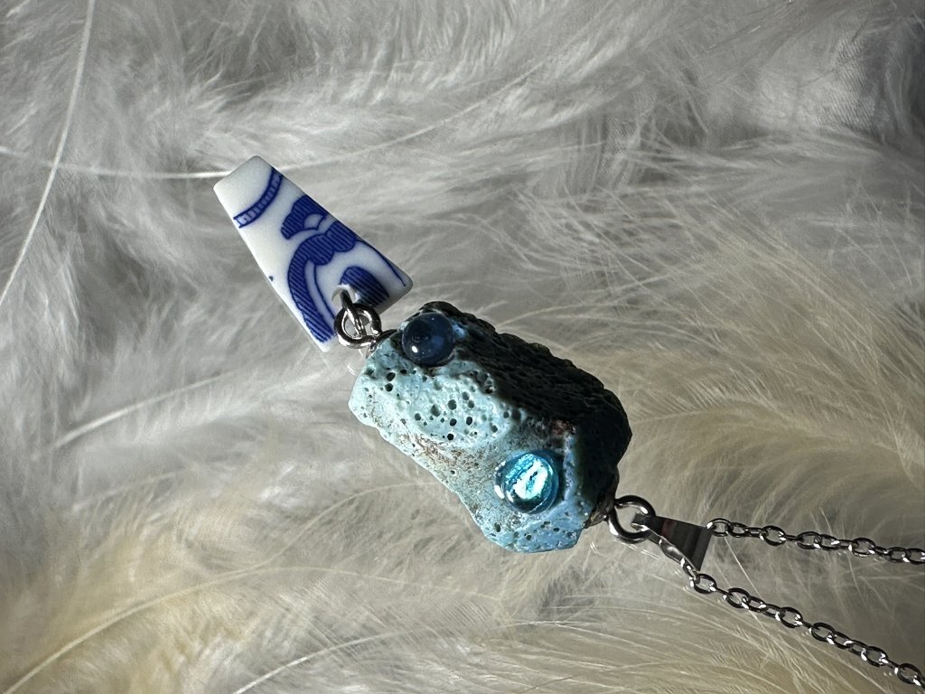 Tyto přívěsky jsou unikátními nálezy, které hledám v řece Sázavě. Vše brousím a zpracovávám do jedinečných šperků, které jsou jedním jediným originálem. Dozdobuji porcelánem a skleněnými kapkami, které v sobě obsahují stříbro.