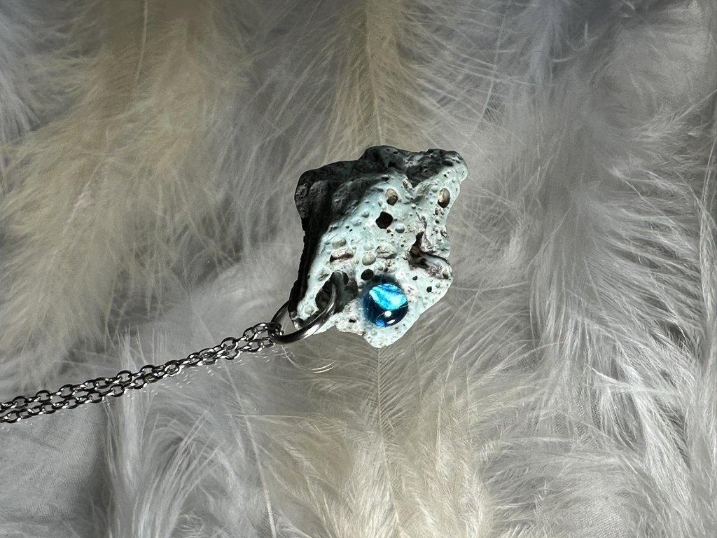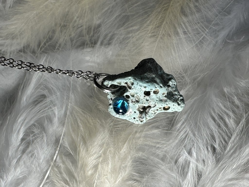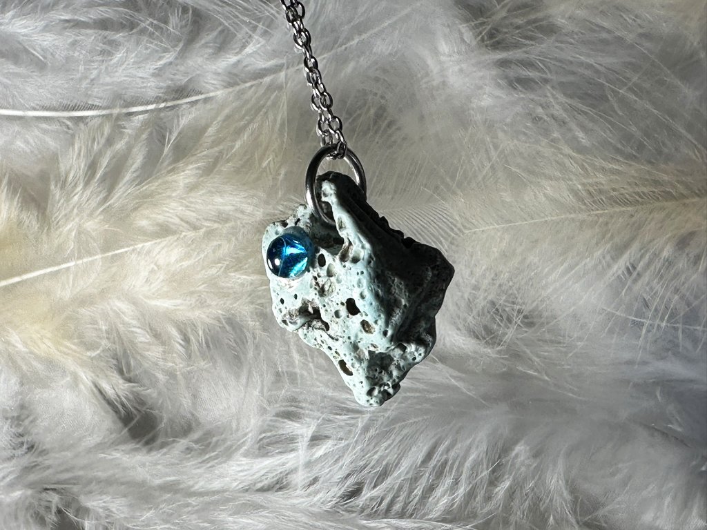 Tyto přívěsky jsou unikátními nálezy, které hledám v řece Sázavě. Vše brousím a zpracovávám do jedinečných šperků, které jsou jedním jediným originálem. Dozdobuji kousky skla, které v sobě obsahuje stříbro a tím háže jemné a přesto nepřehlédnutelné odlesky.