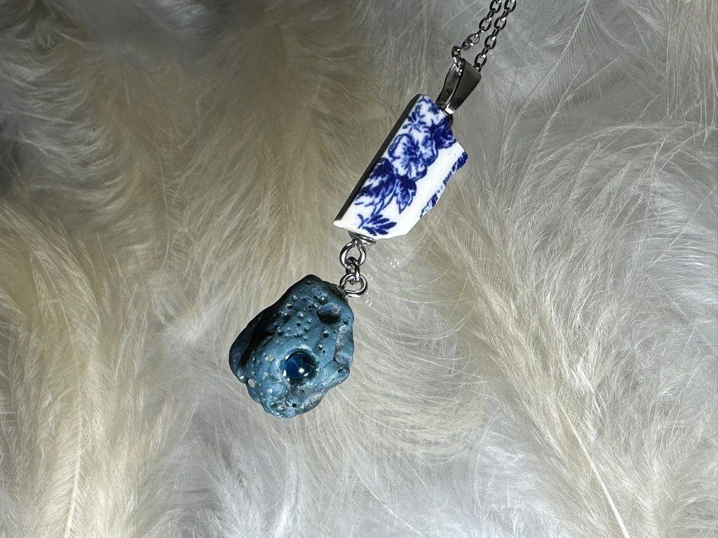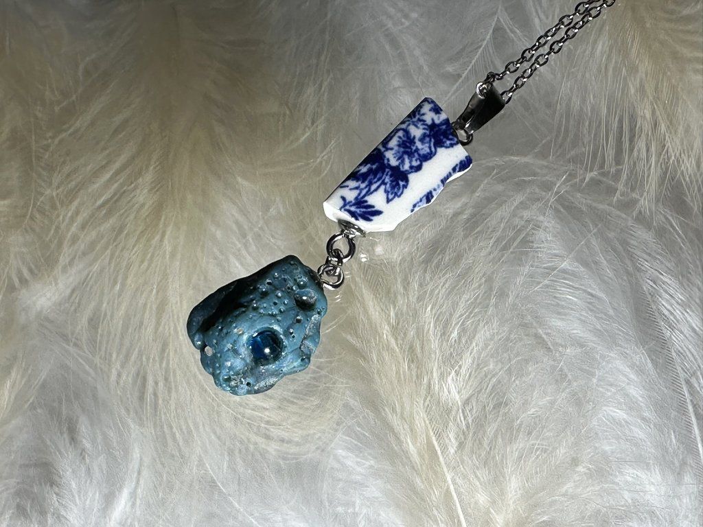 Tyto přívěsky jsou unikátními nálezy, které hledám v řece Sázavě. Vše brousím a zpracovávám do jedinečných šperků, které jsou jedním jediným originálem. Dozdobuji porcelánem a skleněnými kapkami, které v sobě obsahují stříbro.