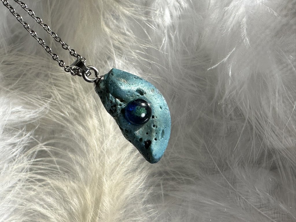 Zavěšeno na řetízku z kvalitní, antialergenní nerez oceli o délce 55 cm.