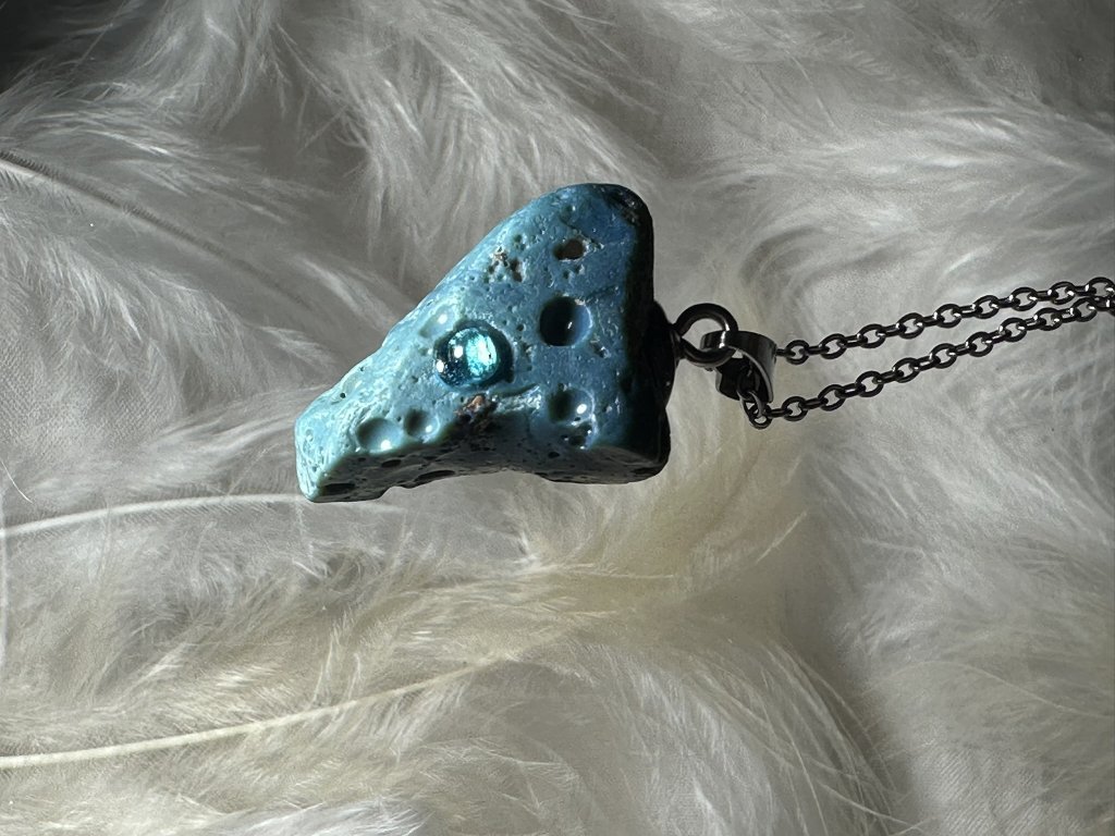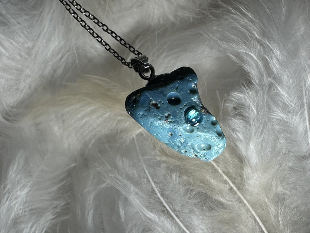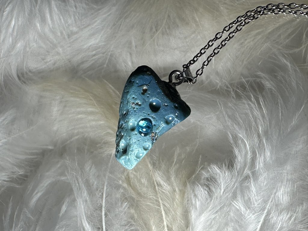 Tyto přívěsky jsou unikátními nálezy, které hledám v řece Sázavě. Vše brousím a zpracovávám do jedinečných šperků, které jsou jedním jediným originálem. Dozdobuji kousky skla, které v sobě obsahuje stříbro a tím háže jemné a přesto nepřehlédnutelné odlesky.