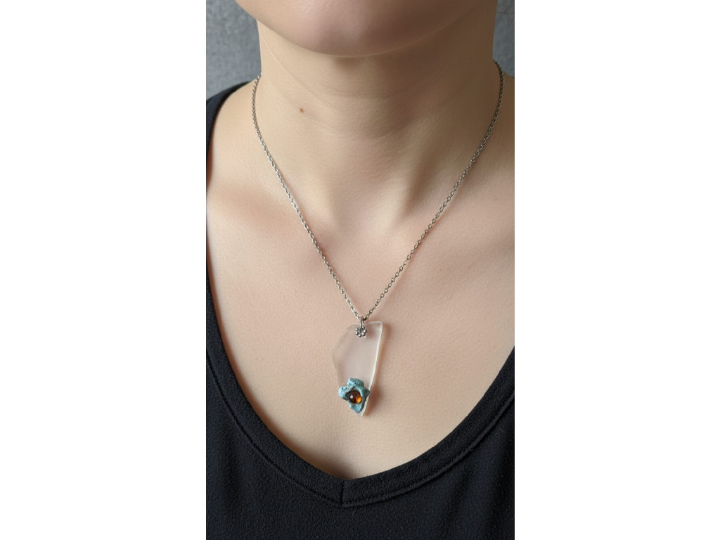 Autorský přívěsek, kde se snoubí krása křehkého skla a zemitost sázavínů. Propojuji zde kolekci Nanovo a Sázavíny a zároveň dva živly - oheň a vodu.