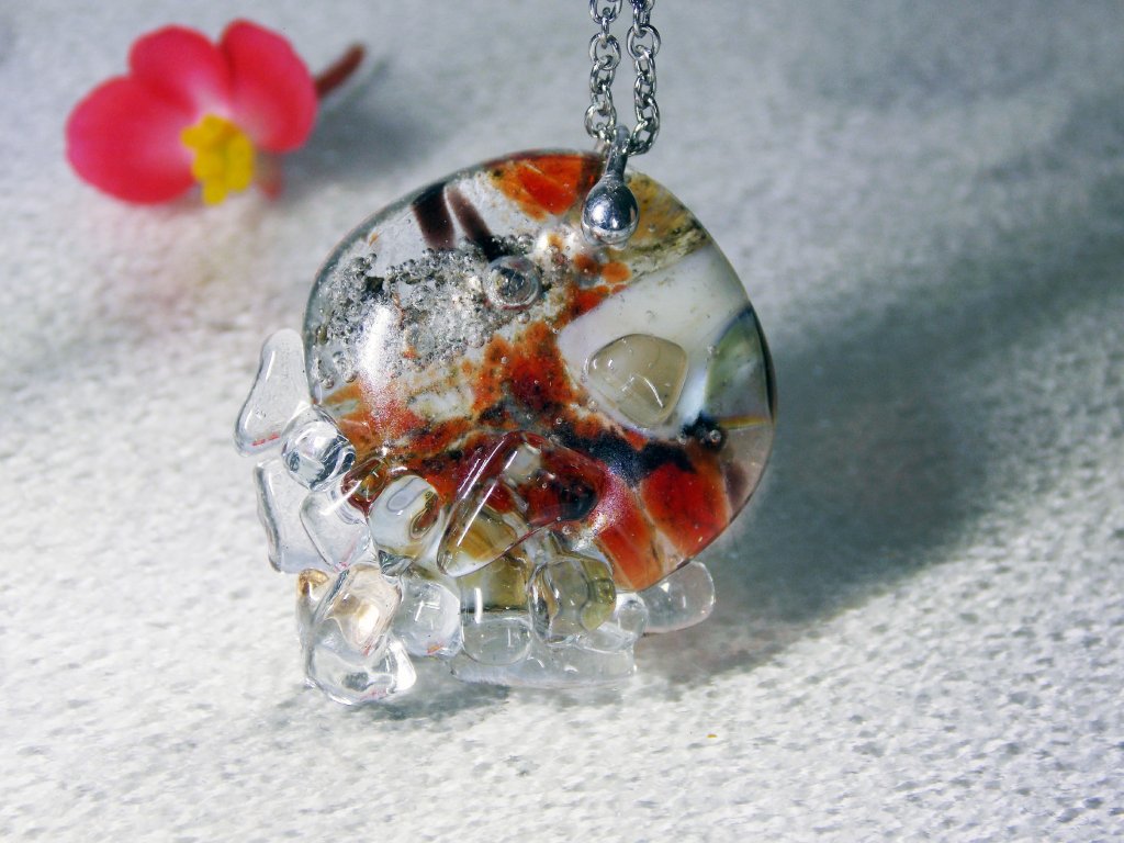 Autorský, nepřehlédnutelný přívěsek v krásných barvách s jemnými bublinkami a spékanými střípky z průzračného skla. Šperk je vhodný na zvláštní událost i každodenní nošení a nádherně září na světle. Zavěšeno na řetízku z antialergenní nerez ocele.