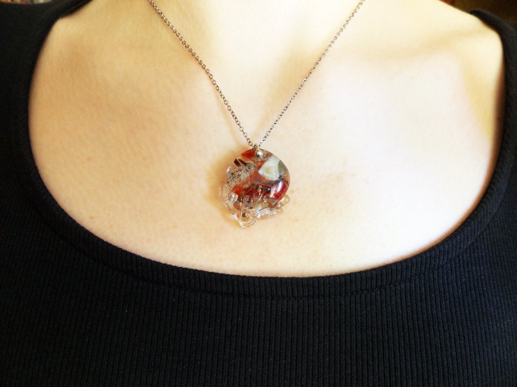 Sklíčka spékám v peci a zabrušuji. Poté přívěsek minimalisticky dozdobuji cínem, který patinuji a leštím.