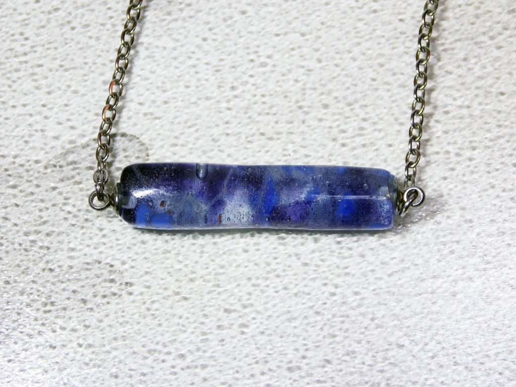 Autorský přívěsek tubičkového tvaru z průzračného skla se svým mikrosvětem ve fialové a modré barvě. Přívěsek krásně vyniká na světle a je jemnou a ojedinělou ozdobou. Doplněno kvalitním řetízkem z antialergenní nerez oceli.
