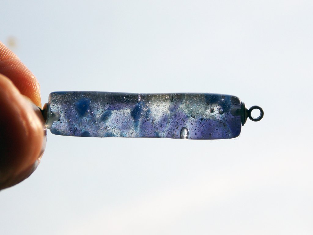 Přívěsek je vyroben spékáním a broušením skleněných střípků.