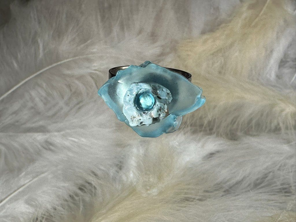 Autorský prsten, kde se snoubí krása křehkého skla a zemitost sázavínů. Propojuji zde kolekci Nanovo a Sázavíny a zároveň dva živly - oheň a vodu.