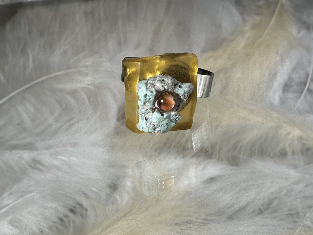 Autorský prsten, kde se snoubí krása křehkého skla a zemitost sázavínů. Propojuji zde kolekci Nanovo a Sázavíny a zároveň dva živly - oheň a vodu.