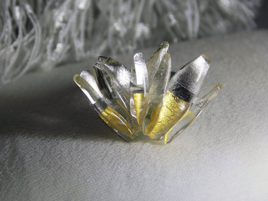 Prsten je vyroben ze skleněných střípků, které spékám ve sklářské peci, ale ponechávám jejich ojedinělý, nepravidelný tvar. Sklo v sobě obsahuje stříbro.