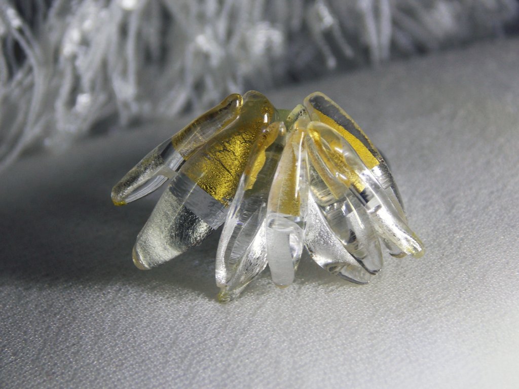 Krásný prsten ze střípků průzračného skla, které v sobě obsahuje kousky zlata i stříbra a tím je prsten zářící a luxusní ozdobou. Velmi zajímavý šperk, který vás zkrášlí a odliší. Kovový kroužek je z velmi kvalitní, antialergenní chirurgické oceli, která je vysoce leštěna. Můžete jej nastavit na jakoukoliv velikost, neškrábe a velmi příjemně se nosí.