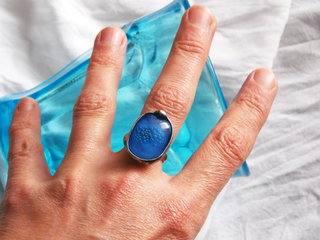 Prsten je vyroben z modrého skla s krásnými bublinami. Vše je zapečeno v peci a zabroušeno.