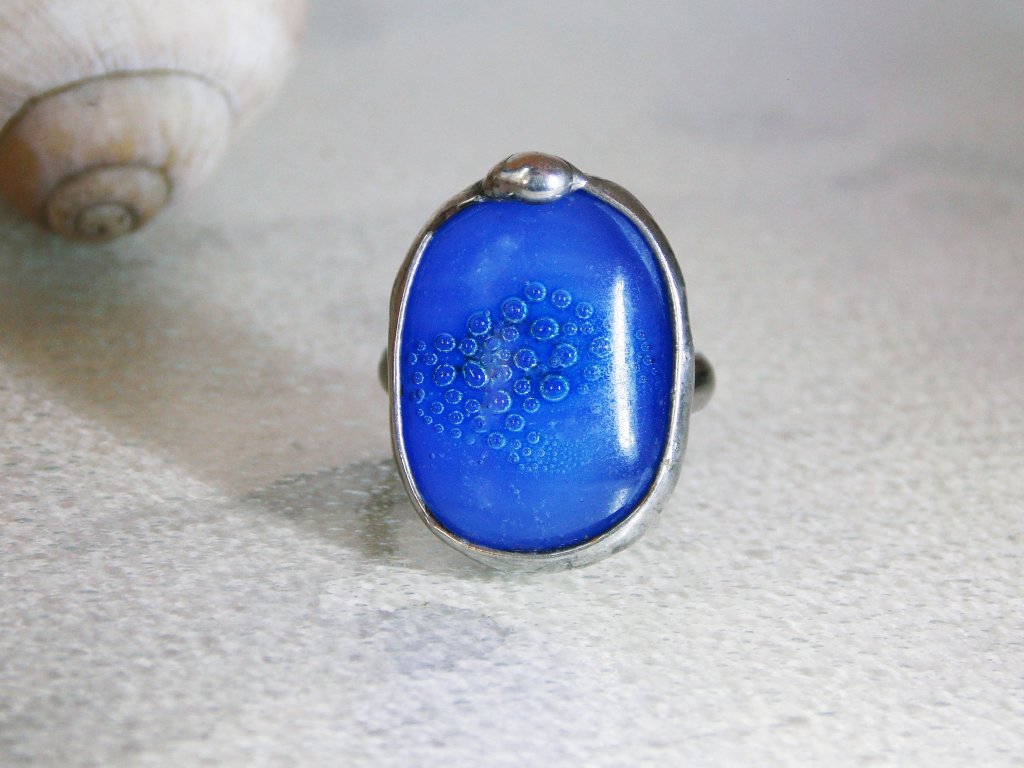 Výrazný, modrý prsten plný bublinek. Sklo dozdobuji cínováním. Kroužek je z kvalitní antialergenní nerez ocele a má nastavitelnou velikost. Přerušení kroužku, aby se mohl roztahovat, či stahovat, je uschováno pod sklem, takže kroužek je po obvodu prstu celistvý.