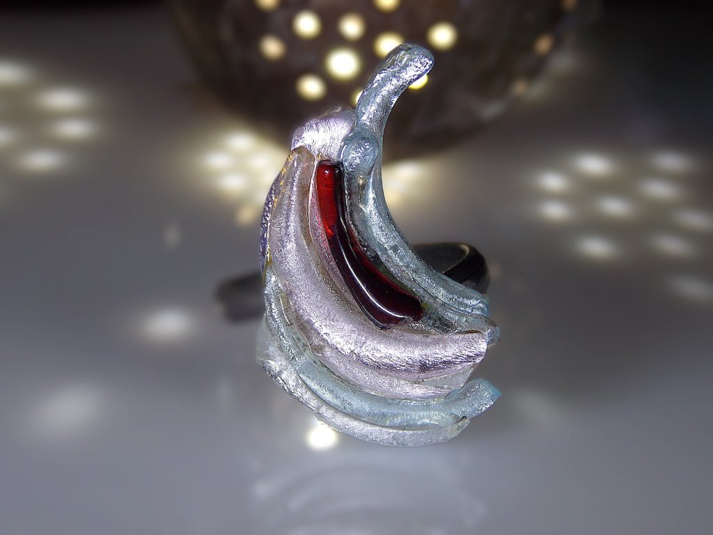 Prsten je vyroben ze skleněných střípků, které spékám ve sklářské peci, ale ponechávám jejich ojedinělý, nepravidelný tvar. Sklo v sobě obsahuje stříbro.