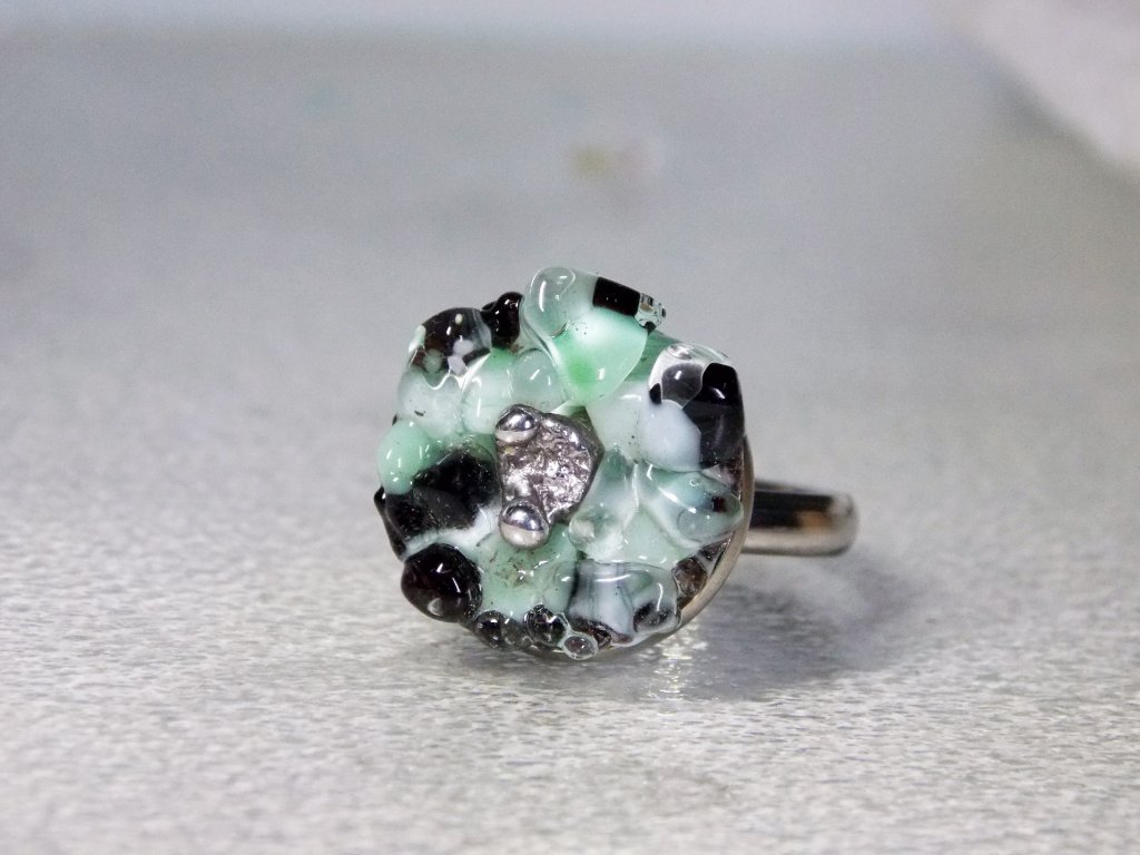 Prsten je vyroben ze skleněných střípků, které vytvářejí krásné, barevné krystalky. Vše je zapečeno v peci a broušeno.