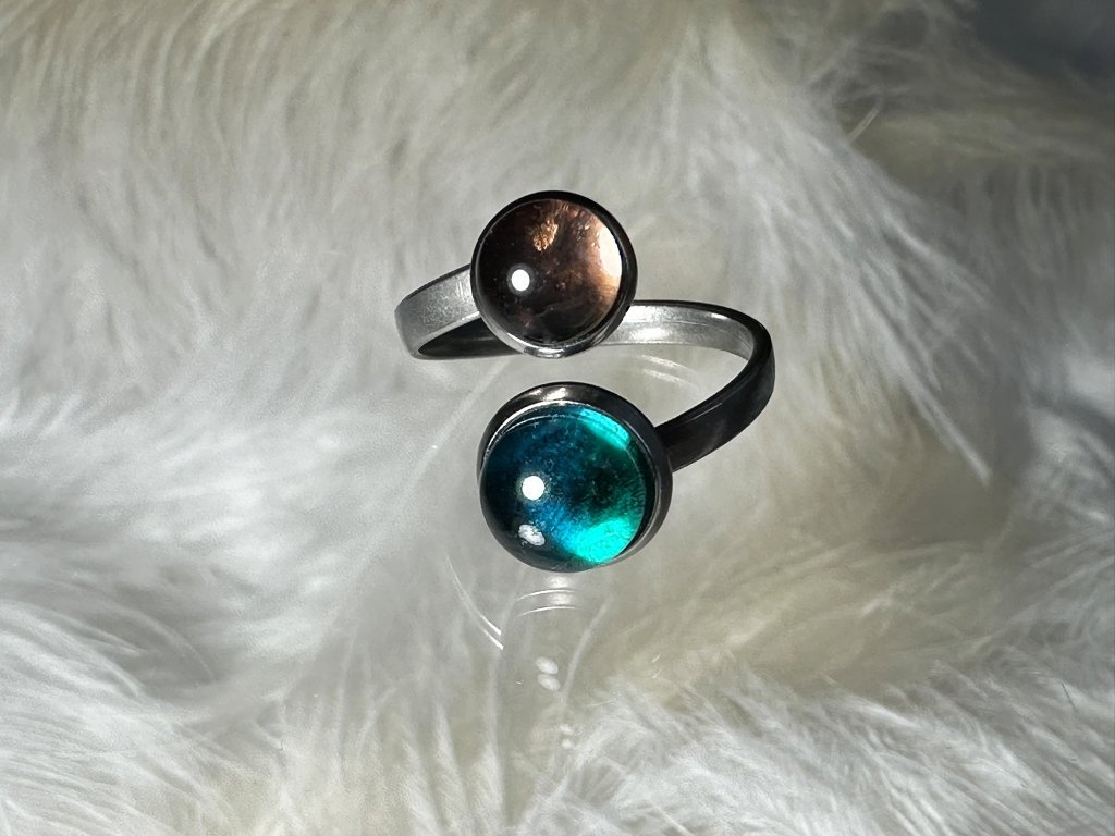 Dvojitý prsten z oblých bobulek průzračného skla v barvách narůžovělé a tyrkysové. Prsten vypadá velmi zajímavě a moc pěkně vyniká na ruce, kde je jemnou a přesto nepřehlédnutelnou ozdobou. Kroužek je z kvalitní, antialergenní nerez oceli a má univerzální velikost. Můžete jej zvětšovat či zmenšovat přesně podle vaší velikosti prstu. Prsten pak krásně sedí a moc příjemně se nosí.