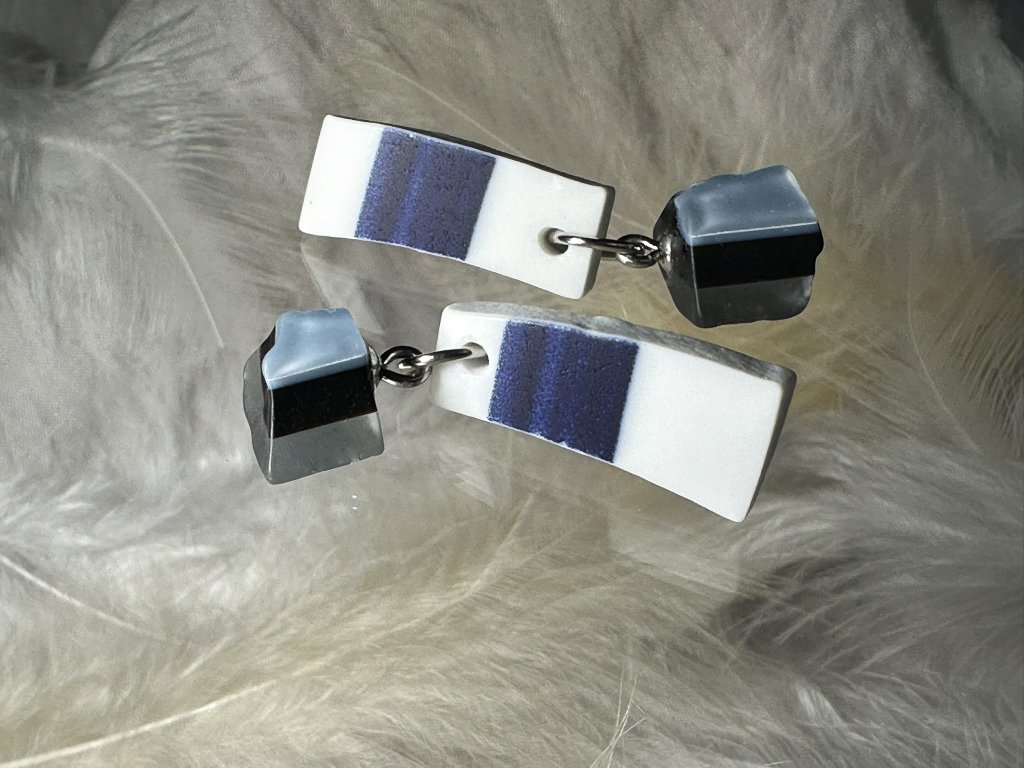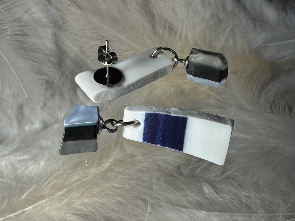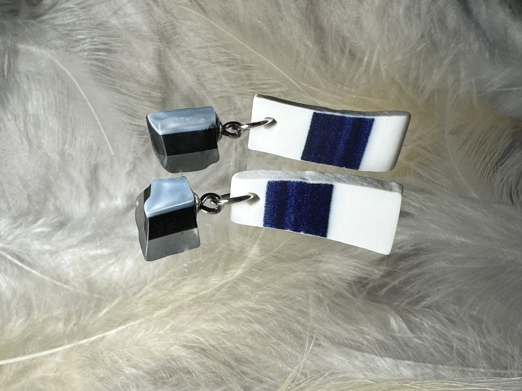 Sklo je doplněno nalezeným porcelánem. Celé náušnice mají délku 4 cm, zapínání je puzetové.