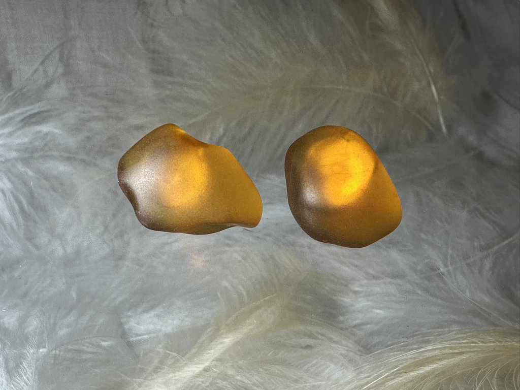 Každý střípek mi projde několikrát rukama, dobrušuji, kombinuji a pískuji jej. Tím vzniká nádherný, jemný, matný efekt, ale je zároveň zachována průzračnost a světlo krásně sklem prostupuje v různých úhlech a tak se náušnice budou měnit po celý den.