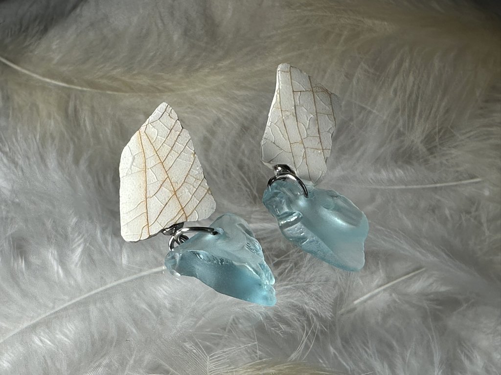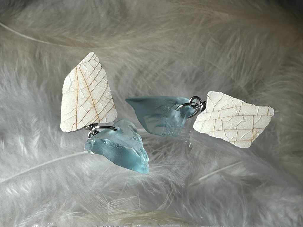 Sklo je doplněno nalezenou keramikou. Celé náušnice mají délku 5 cm, zapínání je puzetové.