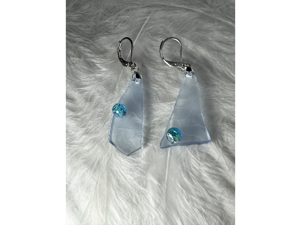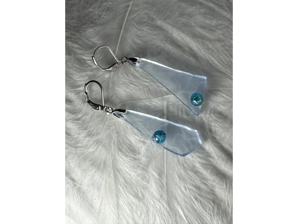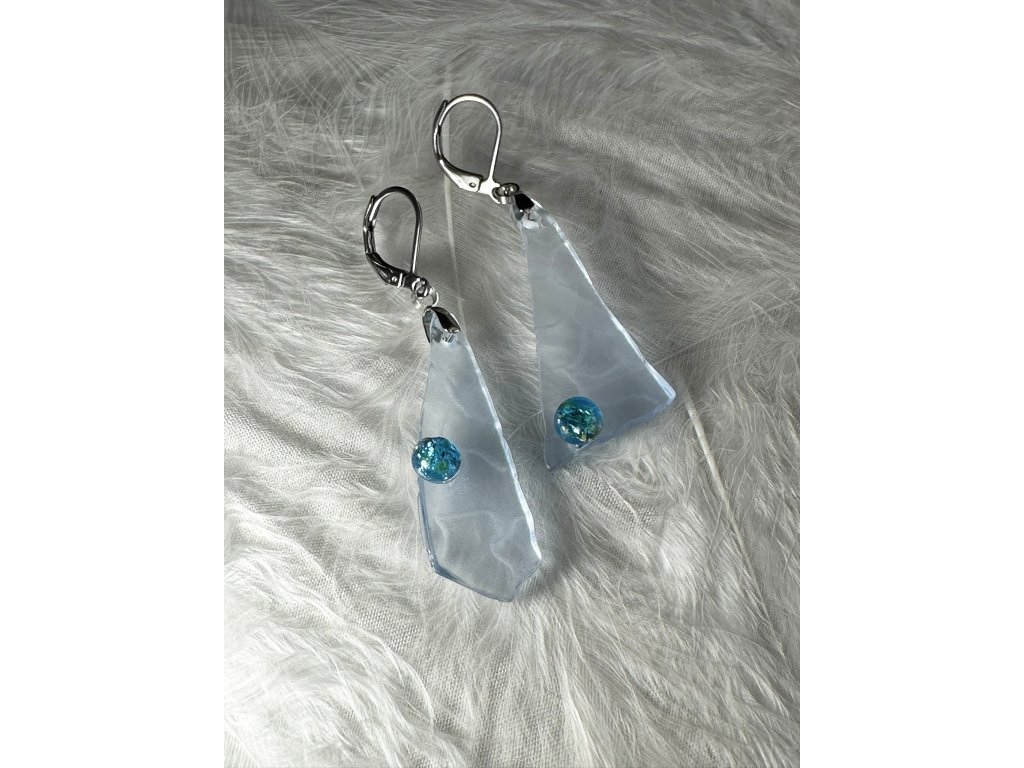 Délka náušnic je 4 cm. Sklo je dozdobeno skleněnou kapkou, která v sobě obsahuje stříbro a tím háže krásné, jemné odlesky.