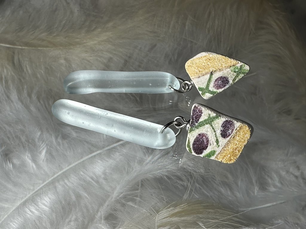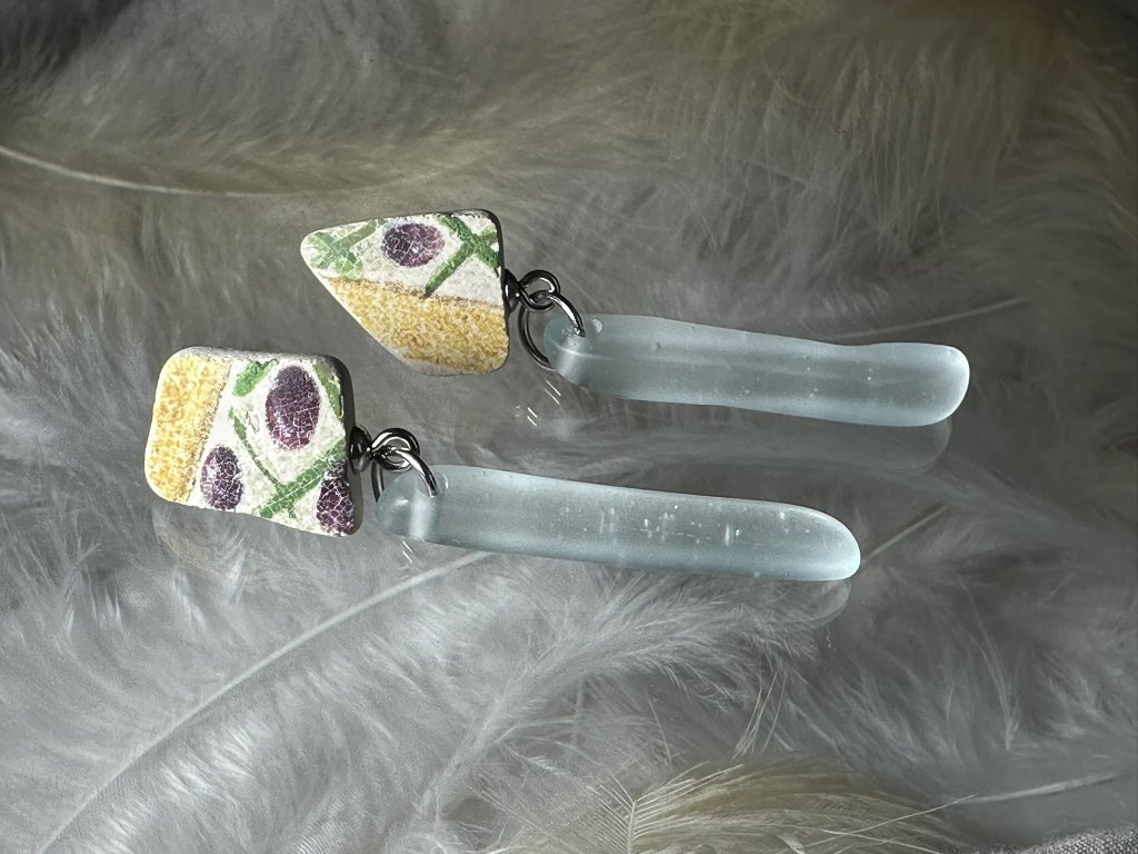 Sklo je doplněno nalezenou keramikou. Celé náušnice mají délku 6 cm, zapínání je puzetové.