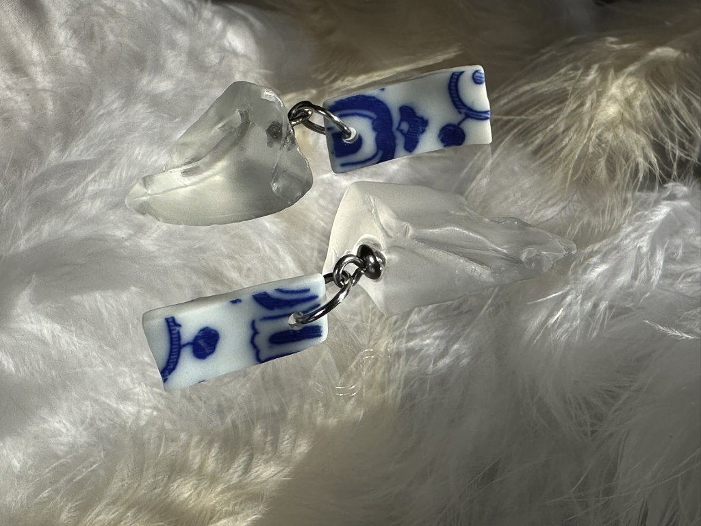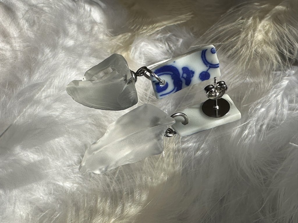 Sklo je doplněno nalezeným porcelánem. Celé náušnice mají délku 4, 5 cm, zapínání je puzetové.