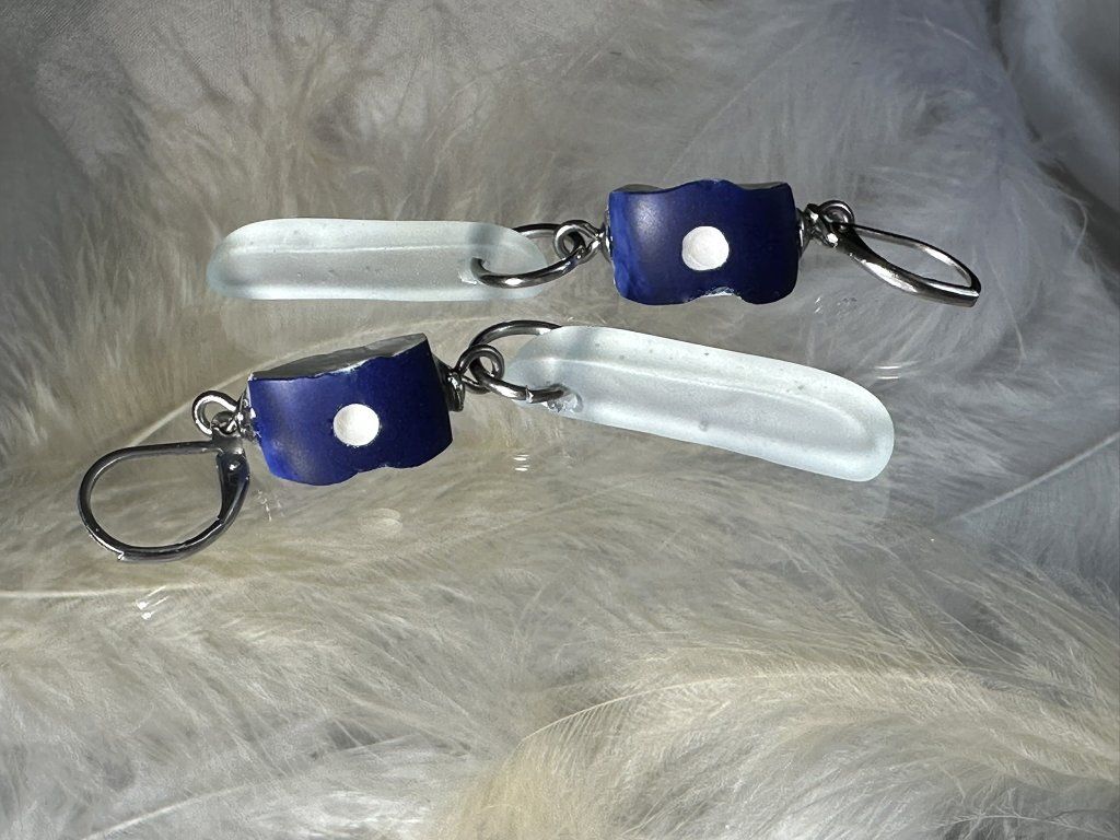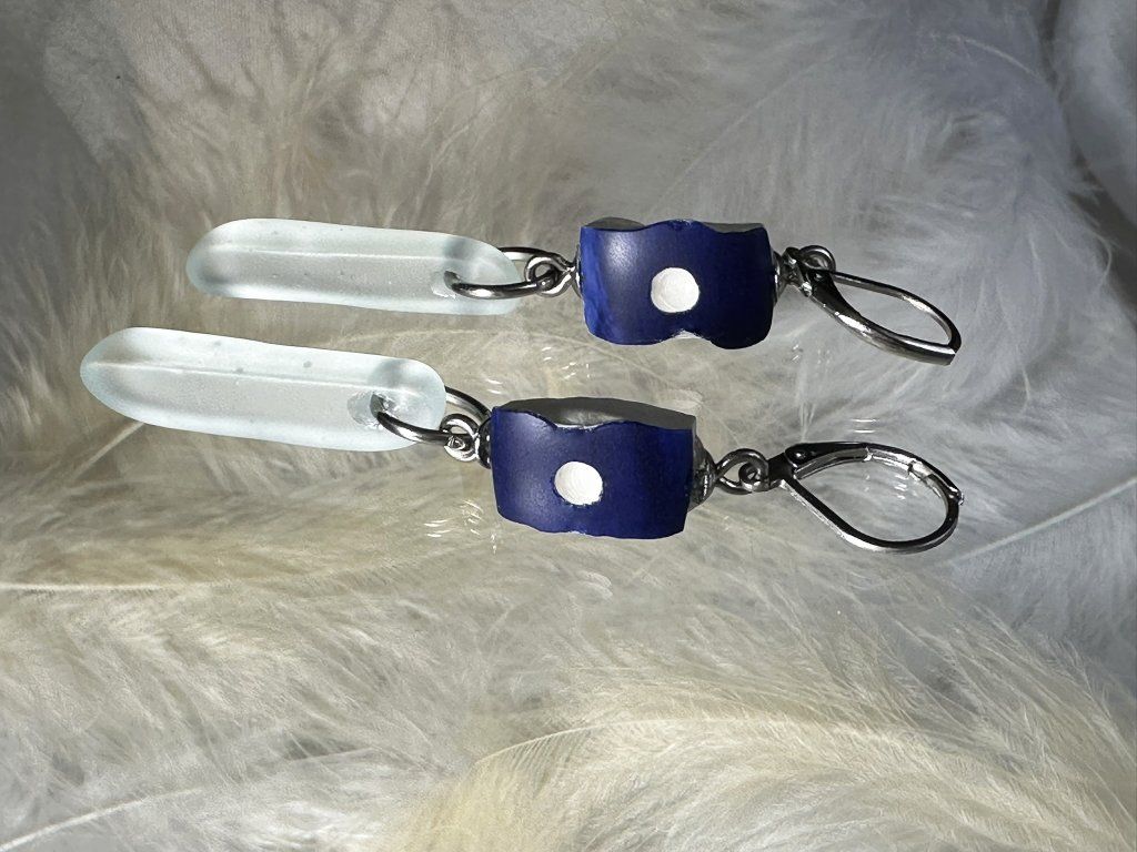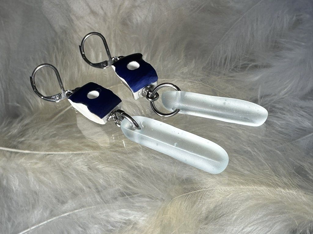 Délka celých náušnic je 5 cm. Sklo je doplněno keramikou.